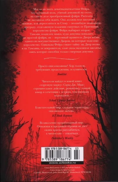 Могла ли знать девятнадцатилетняя Фейра, что огромный волк, убитый девушкой на охоте, — на самом деле преображенный фэйри. Расплата не заставила себя ждать. Она должна или заплатить жизнью, или переселиться за стену — волшебную невидимую преграду, отделяющую владения смертных от Притиании, королевства фэйри. Фейра выбирает второе. Тамлин, владелец замка, куда девушка попадает, не простой фэйри, он — верховный правитель Двора весны, одного из могущественных Дворов, на которые поделено королевство. Однажды Фейра узнает тайну: на Двор весны и на Тамлина, ее покровителя, злые силы наложили заклятье, снять которое способна только смертная девушка…