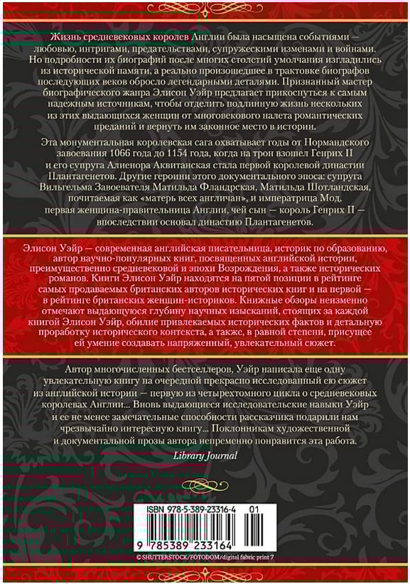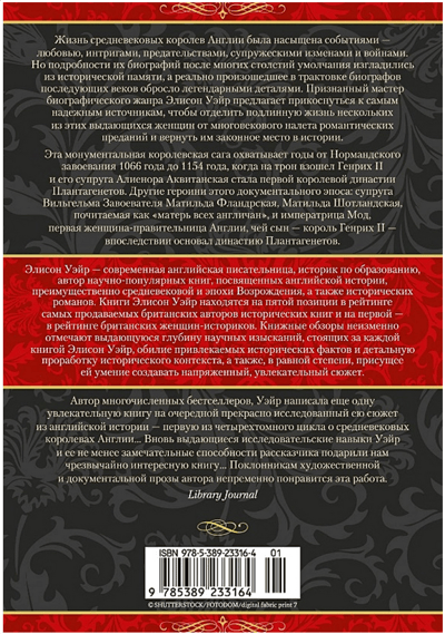 Жизнь средневековых королев Англии была насыщена событиями — любовью, интригами, предательствами, супружескими изменами и войнами. Но подробности их биографий после многих столетий умолчания изгладились из исторической памяти, а реально произошедшее в трактовке биографов последующих веков обросло легендарными деталями. Признанный мастер биографического жанра Элисон Уэйр предлагает прикоснуться к самым надежным источникам, чтобы отделить подлинную жизнь нескольких из этих выдающихся женщин от многовекового налета романтических преданий и вернуть им законное место в истории. Эта монументальная королевская сага охватывает годы от Нормандского завоевания 1066 года до 1154 года, когда на трон взошел Генрих II и его супруга Алиенора Аквитанская стала первой королевой династии Плантагенетов. Другие героини этого документального эпоса: супруга Вильгельма Завоевателя Матильда Фландрская, Матильда Шотландская, почитаемая как «матерь всех англичан», и императрица Мод, первая женщина-правительница Англии, чей сын — король Генрих II — впоследствии основал династию Плантагенетов.