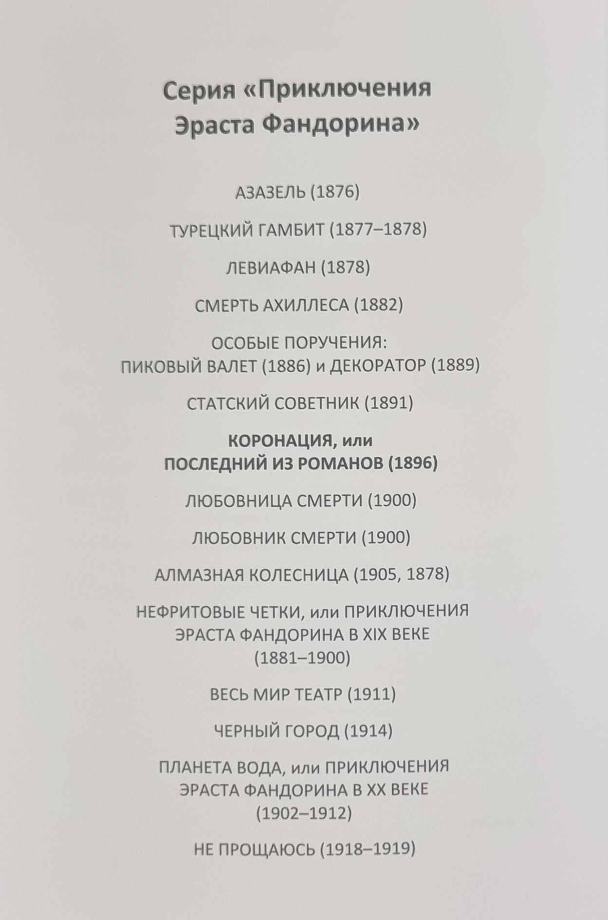 Коронация, или Последний из романов (великосветский детектив) — восьмая книга Бориса Акунина из серии «Приключения Эраста Фандорина». Действие этого романа происходит в 1896 году, накануне коронации императора Николая II. Похищен Михаил, четырёхлетний сын великого князя Георгия Александровича. Похититель, называющий себя «доктор Линд», требует бриллиант «граф Орлов», которым украшен императорский скипетр, в обмен на принца. Если сделка не состоится, ребёнок будет возвращён родителям по частям. Но без скипетра не может состояться коронация. Эраст Петрович Фандорин берётся спасти честь монархии. Повествование ведется в виде дневника от имени Афанасия Зюкина, дворецкого великого князя Георгия Александровича. Книга воссоздаёт трагическую атмосферу России конца XIX века и описывает Ходынскую катастрофу.