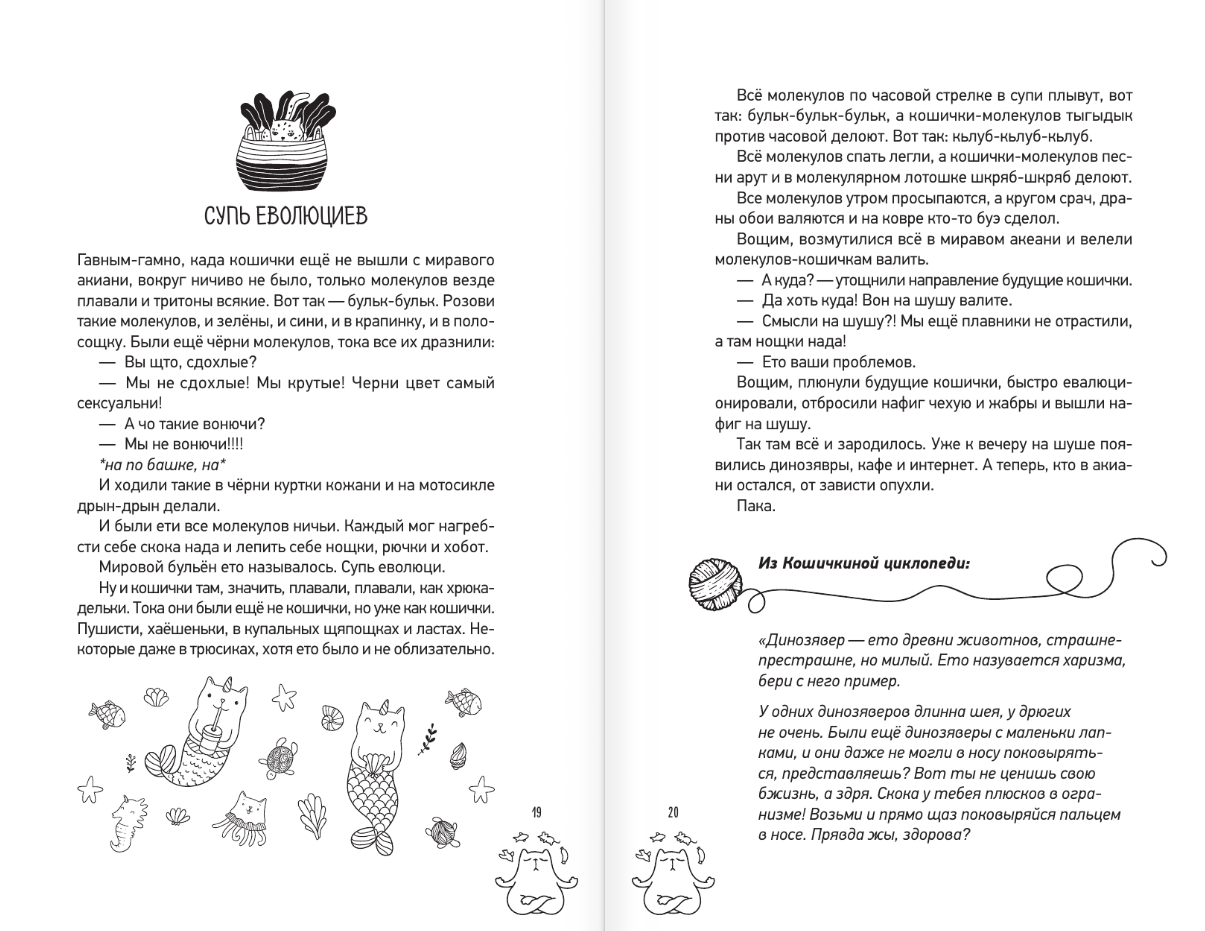 Штош, тогда ты по адресу! Вот тебе эта книга. Она свернется теплым клубком на руках и расскажет о вселенной котиков. О том, что сначала появились они, а потом мы. Что тыгыдык — на самом деле фитнес, а лучшее средство для снятия стресса — рыбный чай. О том, что все мы иногда котики, которых достали все вокруг и которым очень хочется сбежать, пожаловаться, выговориться — а потом, вдохновившись, с новыми силами (выкапывать цветы из горшков) жить эту жизнь. Эта книга — как припрятанная вкусняшка. Она наполнит твою почти пустую копилку радости и подарит спокойствие и уют, ведь котики и смех — лучшее лекарство от плохого настроения!