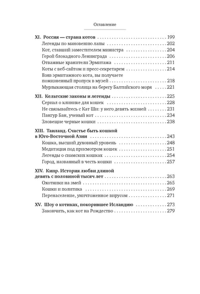 В этом путешествии по миру кошек вам предстоит узнать о легендарных сиамских кошках в храмах Таиланда, котах-«политиках» с Даунинг-стрит, шестипалых любимцах Эрнеста Хемингуэя, кошках — гражданках Рима, которым разрешалось залезать на памятники, и даже о кошках — героических участницах морских и сухопутных сражений.