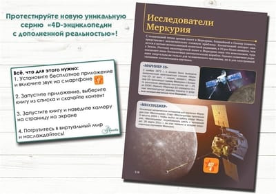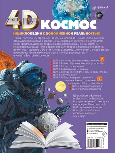 Эта 4D-энциклопедия с дополненной реальностью знакомит читателя с необъятным космосом. Здесь содержится исчерпывающая информация о том, как люди на протяжении тысячелетий стремились к звездам и постепенно познавали недостижимое, но такое манящее небо: строили обсерватории, составляли карты созвездий, изобретали летательные аппараты, запускали в космос человека, высаживались на Луну, выходили в открытое межпланетное космическое пространство... И все это для того, чтобы узнать как можно больше о планетах, Солнце, галактиках, астероидах и множестве других космических объектов. Сегодня вы можете детально и всесторонне изучить каждый из них прямо здесь - на страницах этой 4D-энциклопедии. Открывдля себя мир космоса в объемных "живых" картинках со звуковым сопровождением, вы словно окажетесь на борту космического корабля и воочию поразитесь величию и бесконечности вечного космоса.