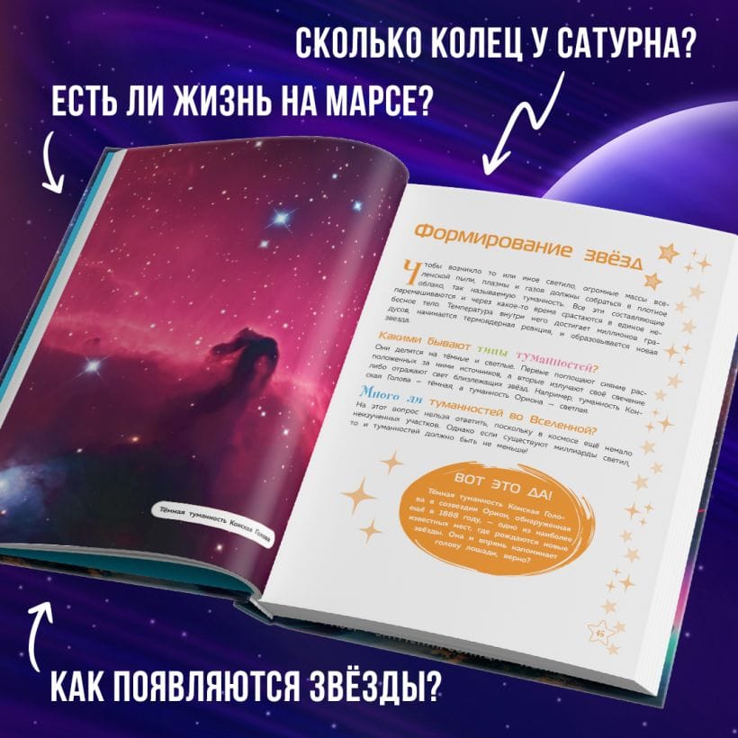 Внимание! Если хочешь узнать всё самое захватывающее о нашей Вселенной, скорее открывай эту книгу! Будет интересно! На Земле ты полюбуешься полярными сияниями, понаблюдаешь за метеорными потоками и метеоритными дождями, увидишь величественные солнечные и лунные затмения. Затем — посетишь Меркурий, Марс, Венеру и другие планеты Солнечной системы! А выйдя за её пределы, ты отправишься к звёздам, станешь свидетелем загадочных процессов их рождения и угасания, увидишь, что находится внутри чёрных дыр, а благодаря Туманности Ориона даже заглянешь в прошлое! Ты пронесёшься по Млечному Пути и доберёшься не только до соседних галактик, но и до центра скопления Девы, а ещё — понаблюдаешь за слияниями космических систем!