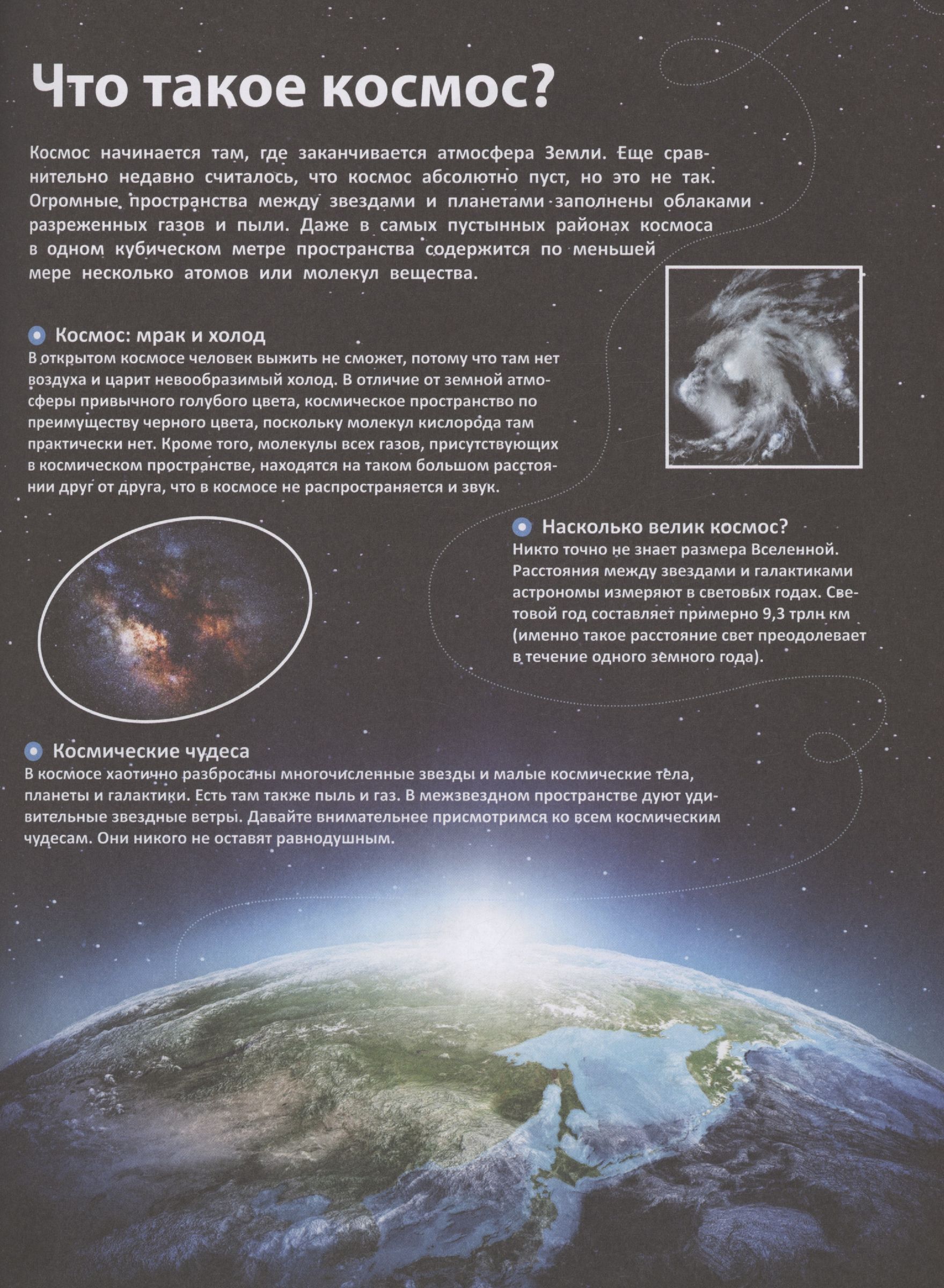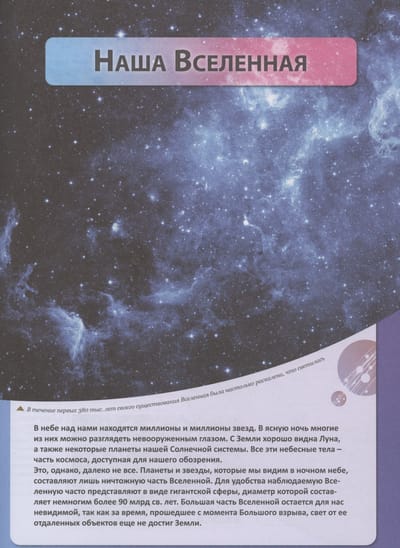 В этой книге читатель найдет множество интересных сведений о ближнем и дальнем космосе. Он узнает о том, как необъятна Вселенная, какое место в Млечном Пути занимает наша Солнечная система, на каком расстоянии от Земли находятся Солнце и другие звезды, а также что станет с нашей Галактикой через миллиард лет. Материал проиллюстрирован большим количеством рисунков, схем и завораживающих фотографий, полученных при помощи телескопов.