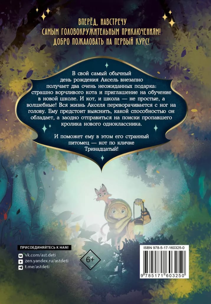 В свой самый обычный день рождения Аксель внезапно получает два очень неожиданных подарка: страшно ворчливого кота и приглашение на обучение в новой школе. И кот, и школа – не простые, а волшебные! Вся жизнь Акселя переворачивается с ног на голову. Ему предстоит выяснить, какой способностью он обладает, а заодно отправиться на поиски пропавшего кролика нового одноклассника. И поможет ему в этом его странный питомец – кот по кличке Тринадцатый!