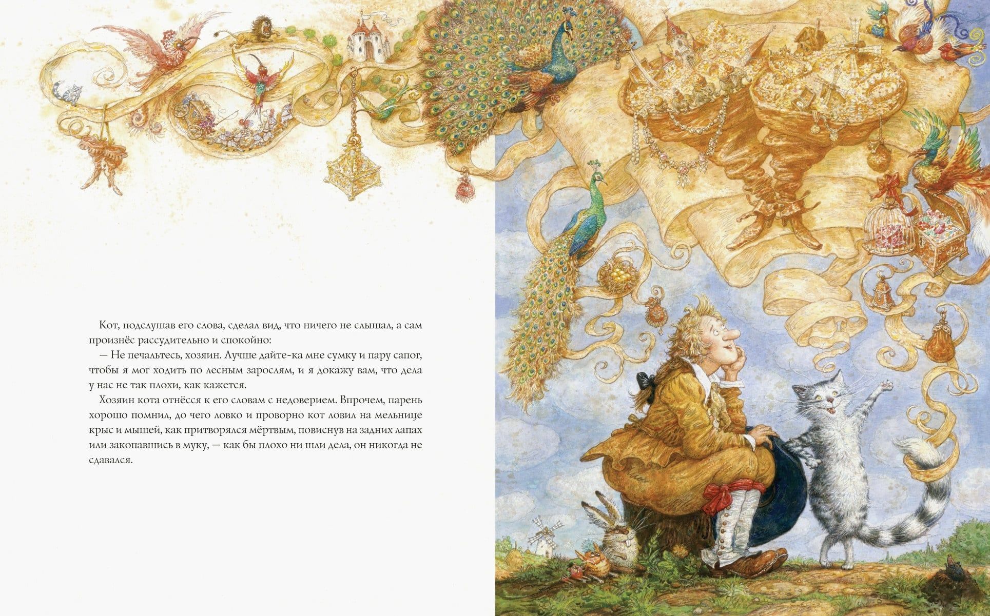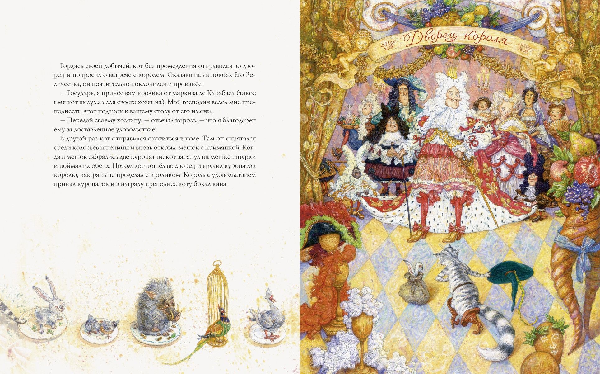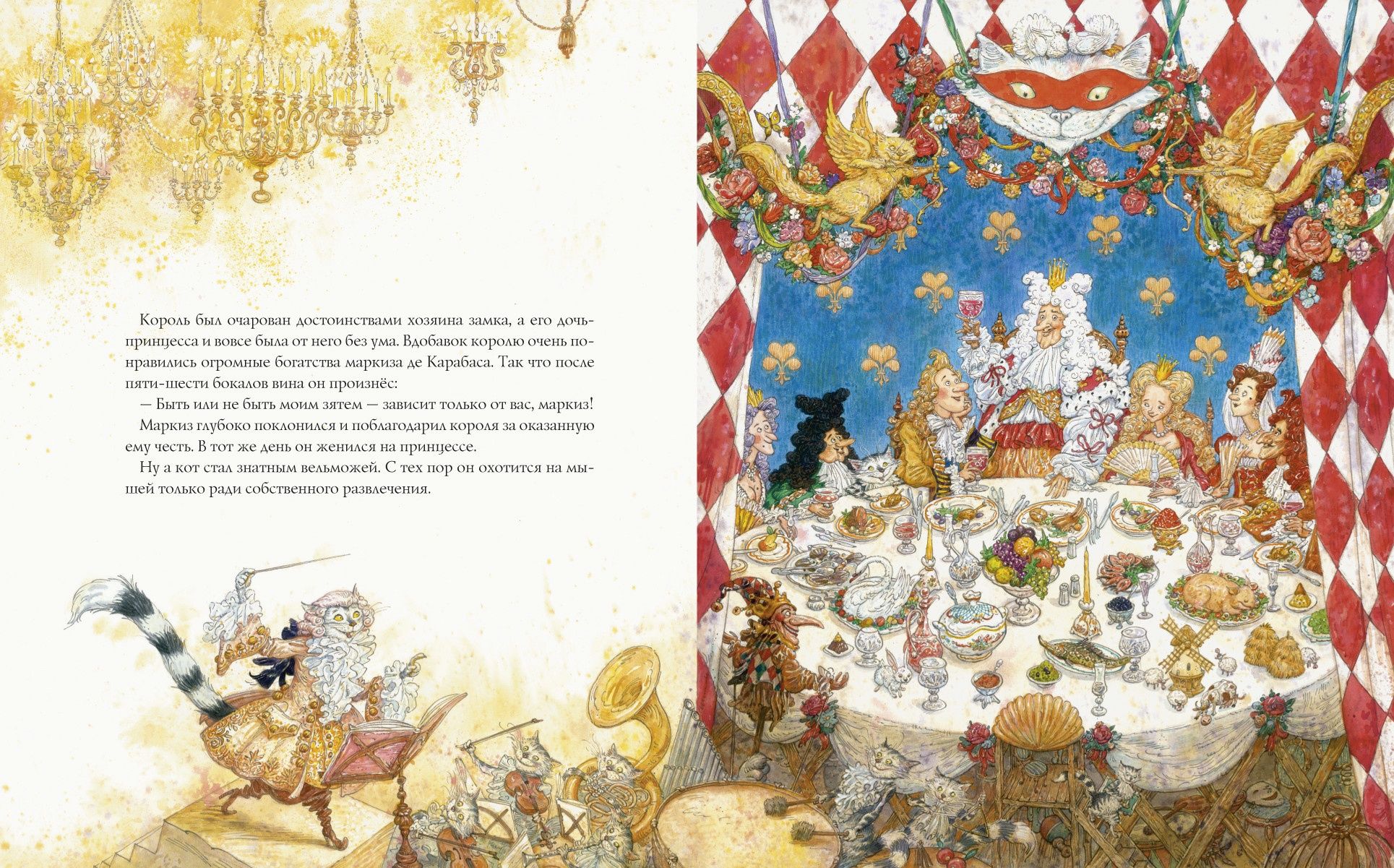 «Кот в сапогах» — старинная сказка, написанная французским сказочником Шарлем Перро, — наполнена юмором, иронией и духом народного творчества. Недаром считается, что за основу своих сказок Перро брал истории, которые кормилица — простая крестьянка — рассказывала его маленькому сыну. А художник Антон Ломаев превратил эту книгу в настоящее театральное представление, где всем заправляет Кот — искусный режиссёр и главный актёр своего собственного спектакля.