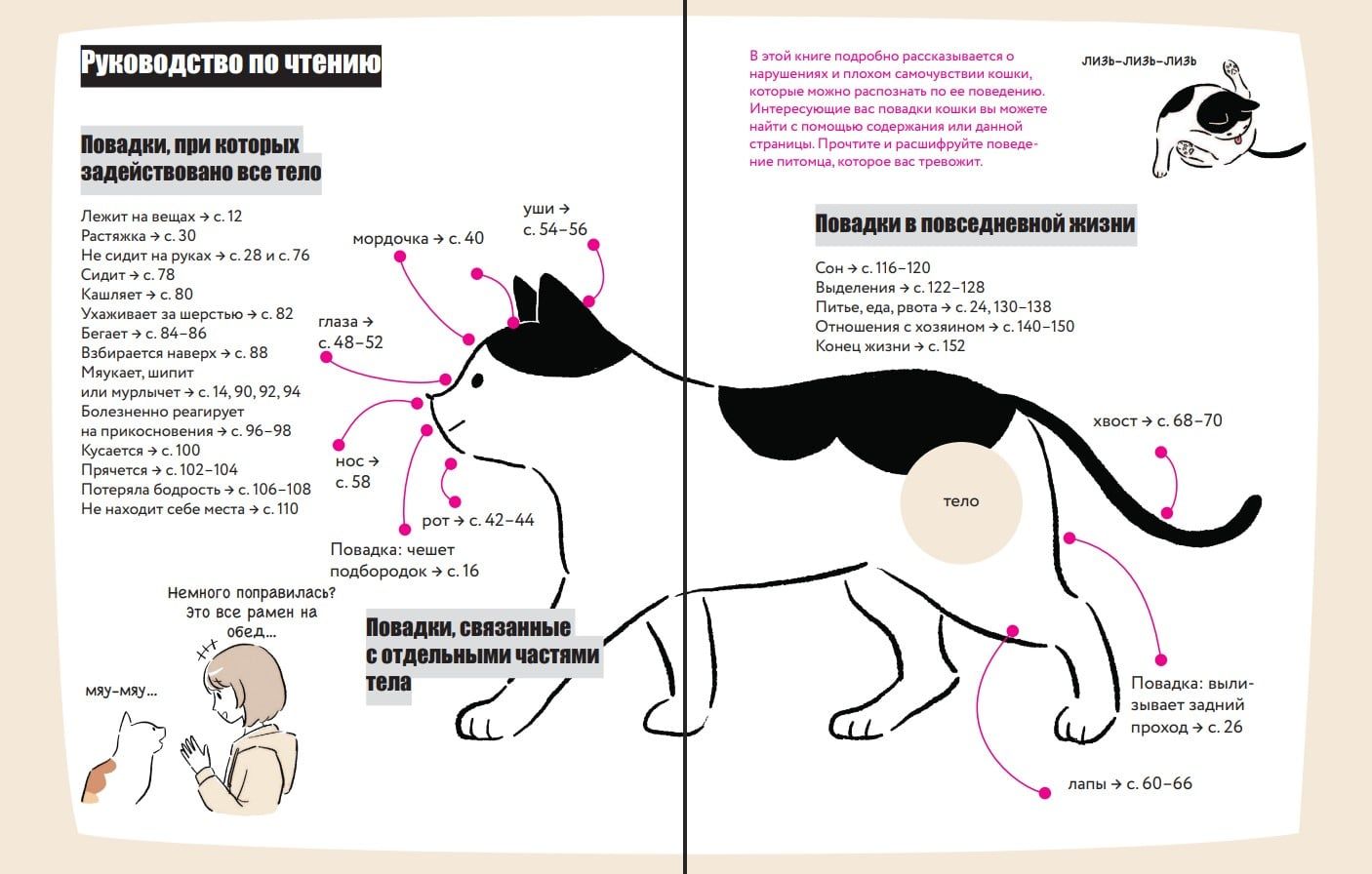 С юмором, простотой и любовью опытный зоопсихолог Йошико Като и ветеринар Фумио Имото расскажут вам о том, что означают кошачьи взгляды, жесты и движения. Как ваш питомец пытается сказать, что любит вас, и когда его поведение может сигнализировать о болезни.