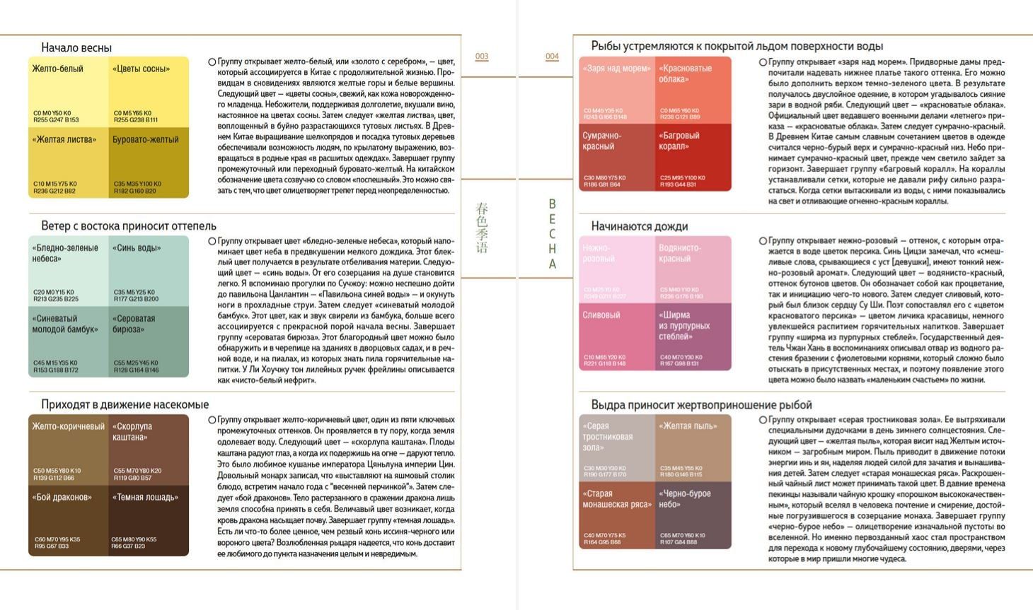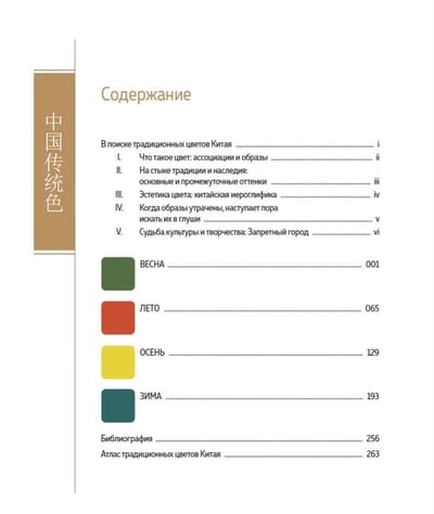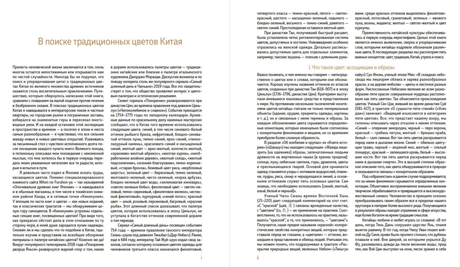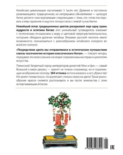 Книга представляет собой исчерпывающую энциклопедию традиционных цветов, применяемых в китайском искусстве и культуре на протяжении веков. Авторы исследуют историю и символику цветов и подробно объясняют их свойства и значения в прошлом и настоящем китайской культуры. Сведения, почерпнутые в колоссальном корпусе древних текстов, богато проиллюстрированы произведениями, хранящимися в Запретном городе — пекинском императорском дворце.
