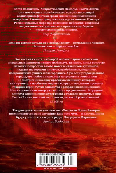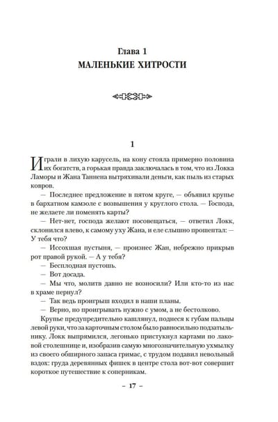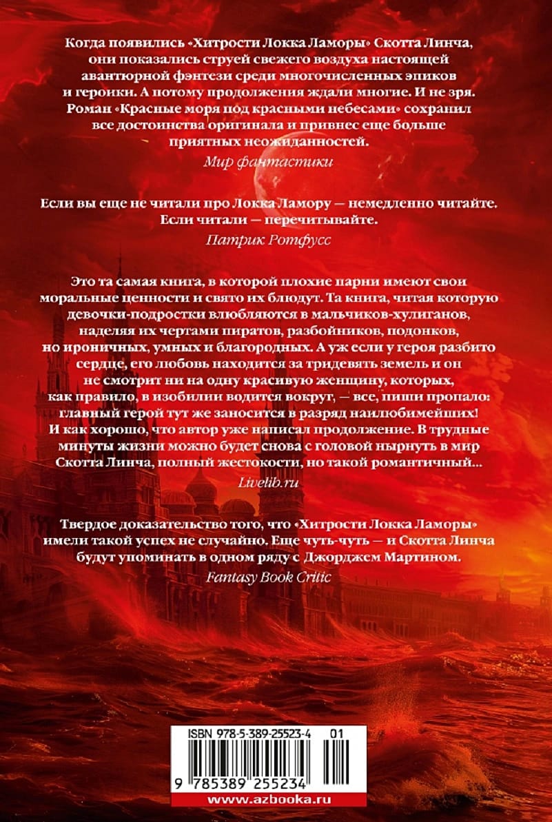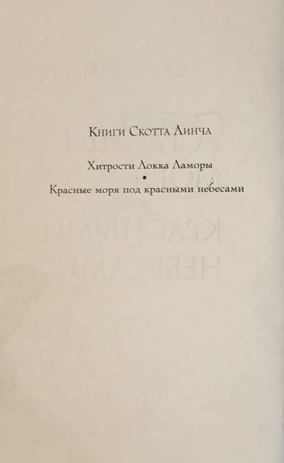 «Свежо, оригинально, крайне занимательно — и великолепно исполнено» (Джордж Мартин). Приключения «благородного канальи» Локка Ламоры продолжаются. Теперь судьба привела его в далекие моря и заставила ходить под черным парусом. Что не самым удачным образом совпадает с кульминацией многолетней аферы — ограбить легендарный игорный дом, где каждую ночь на кон ставятся целые состояния; игорный дом, хозяина которого до дрожи боятся и жестокие бандиты, и власть имущие. Но у вольнонаемных магов далекого Картена свои планы… Продолжение одного из самых ярких фэнтези-дебютов последних лет.