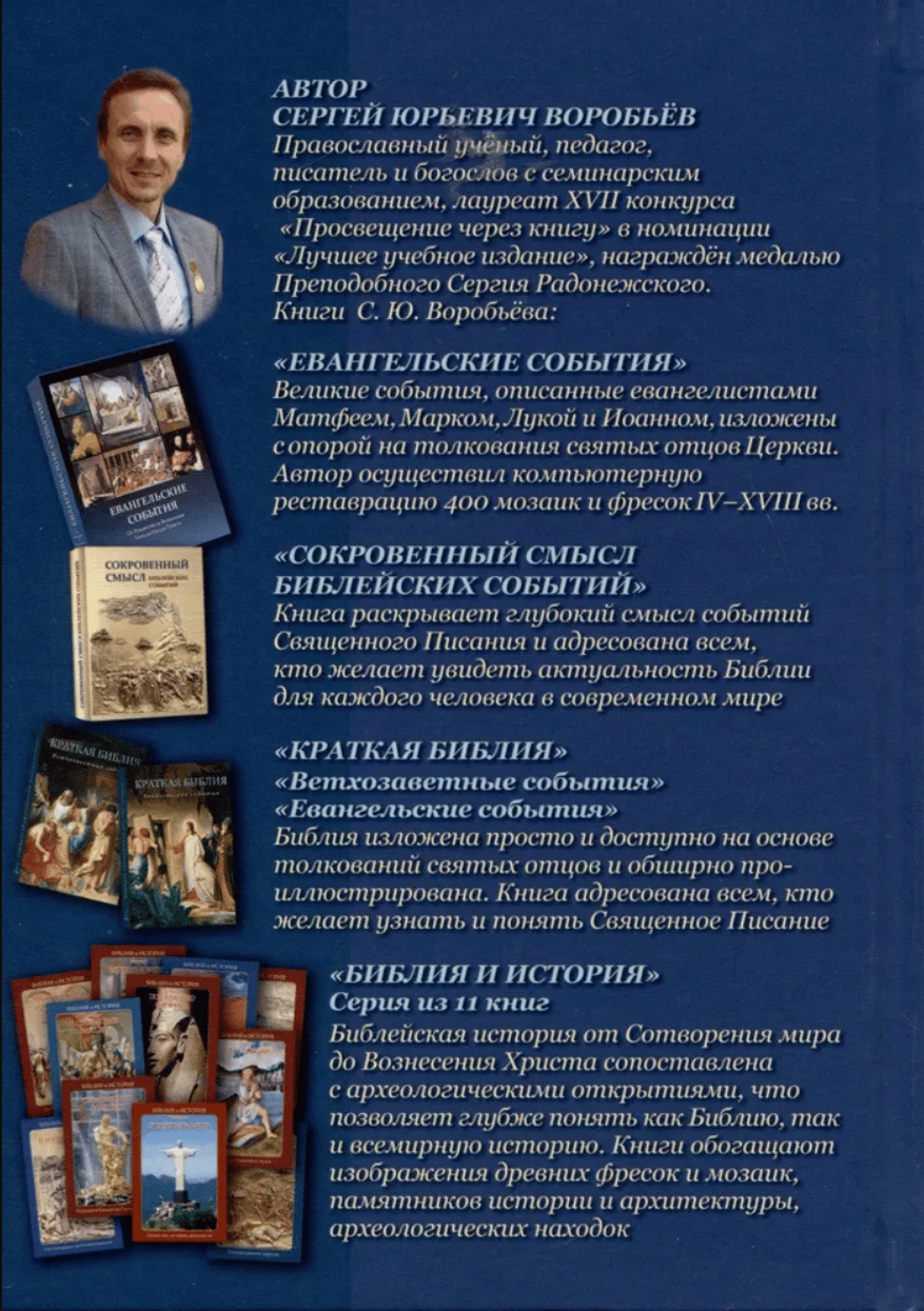 Книга Сергея Воробьева «Что из Библии нужно знать каждому?» содержит краткое изложение основных библейских событий от Сотворения мира до Вознесения Господа Иисуса Христа с объяснением и раскрытием их великого смысла, согласно толкованиям святых отцов Церкви. Данное издание представляет собой сокращенный вариант «Краткой Библии» автора, состоящей из двух томов – «Ветхозаветные события» и «Евангельские события».