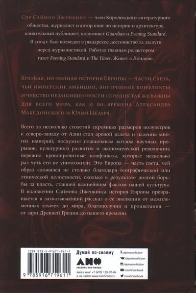 Саймон Дженкинс создает яркий портрет континента с его имперскими амбициями, яростными битвами и экзистенциальными страхами, которые, как считает автор, присущи сегодняшней Европе так же, как во времена Юлия Цезаря и Карла Великого, Жанны д’Арк и Бонапарта, Ленина и Черчилля. В первую очередь автор ценит политическую историю и находящуюся в центре ее внимания нескончаемую борьбу за власть. Не изменяя хронологическому подходу и переходя от страны к стране, от одного исторического события или персонажа к другому, Дженкинс излагает историю континента, который внес, вероятно, самый значительный вклад в формирование современной цивилизации. И это не просто констатация свершившегося факта: к последним страницам читатель «Краткой истории Европы» понимает, насколько настоящее человечества укоренено в его прошлом.