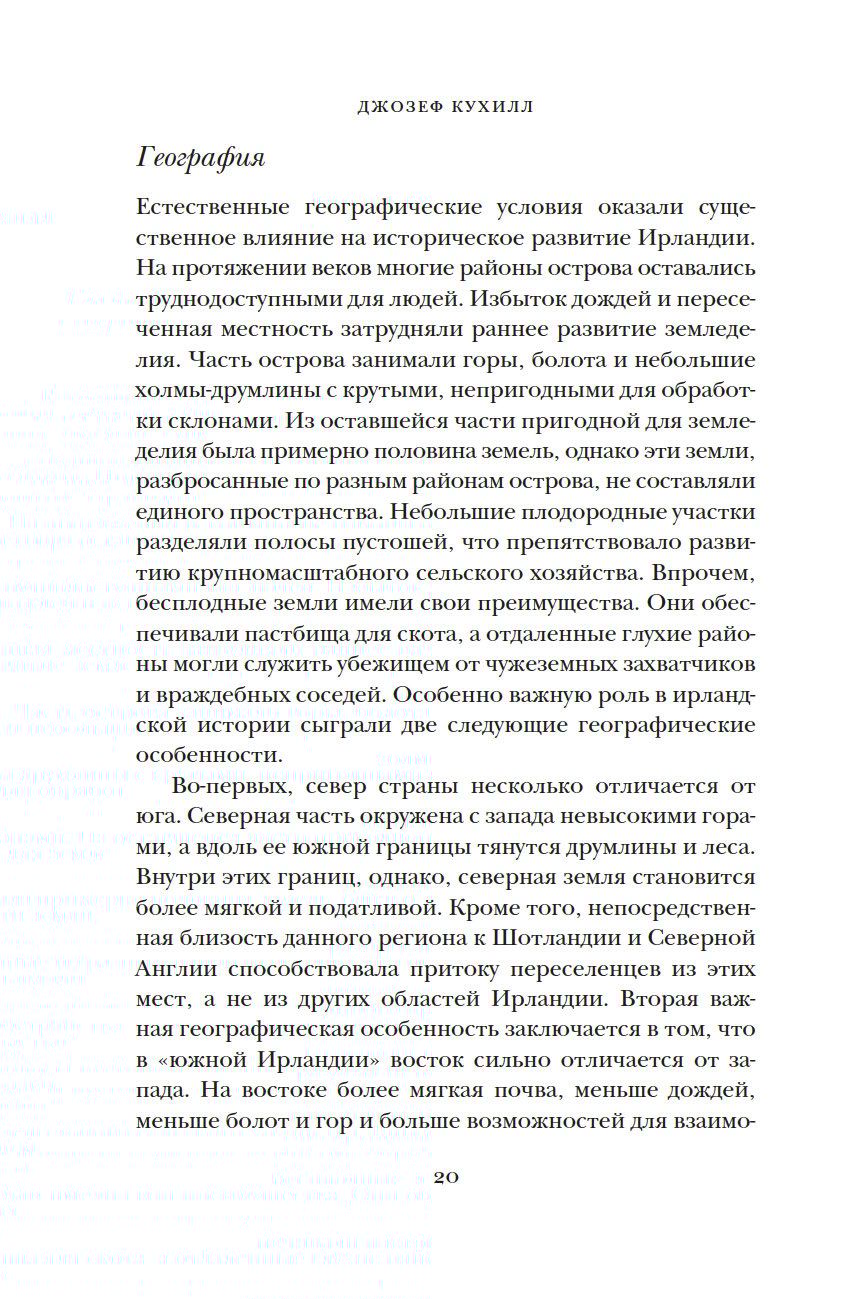 Много веков Ирландия, отдаленный остров на краю Европы, занимала особое место в мировой культуре. За 8000 лет Ирландии пришлось пережить гражданские войны, вражеские набеги и завоевания, голод и религиозные расколы, но этот уникальный и самобытный остров не потерял связь с древними традициями. Британский историк Джозеф Кухилл мастерски описывает захватывающие события прошлого и непростую судьбу ирландцев в настоящем, раскрывая многогранный характер этой страны. Какими были древнекельтские поселения? Как вторжение викингов изменило историю острова? В чем заключалась миссия святого Патрика? Как ирландцам удалось сохранить свой язык? Эта книга заново откроет для вас невероятный остров с удивительной судьбой.