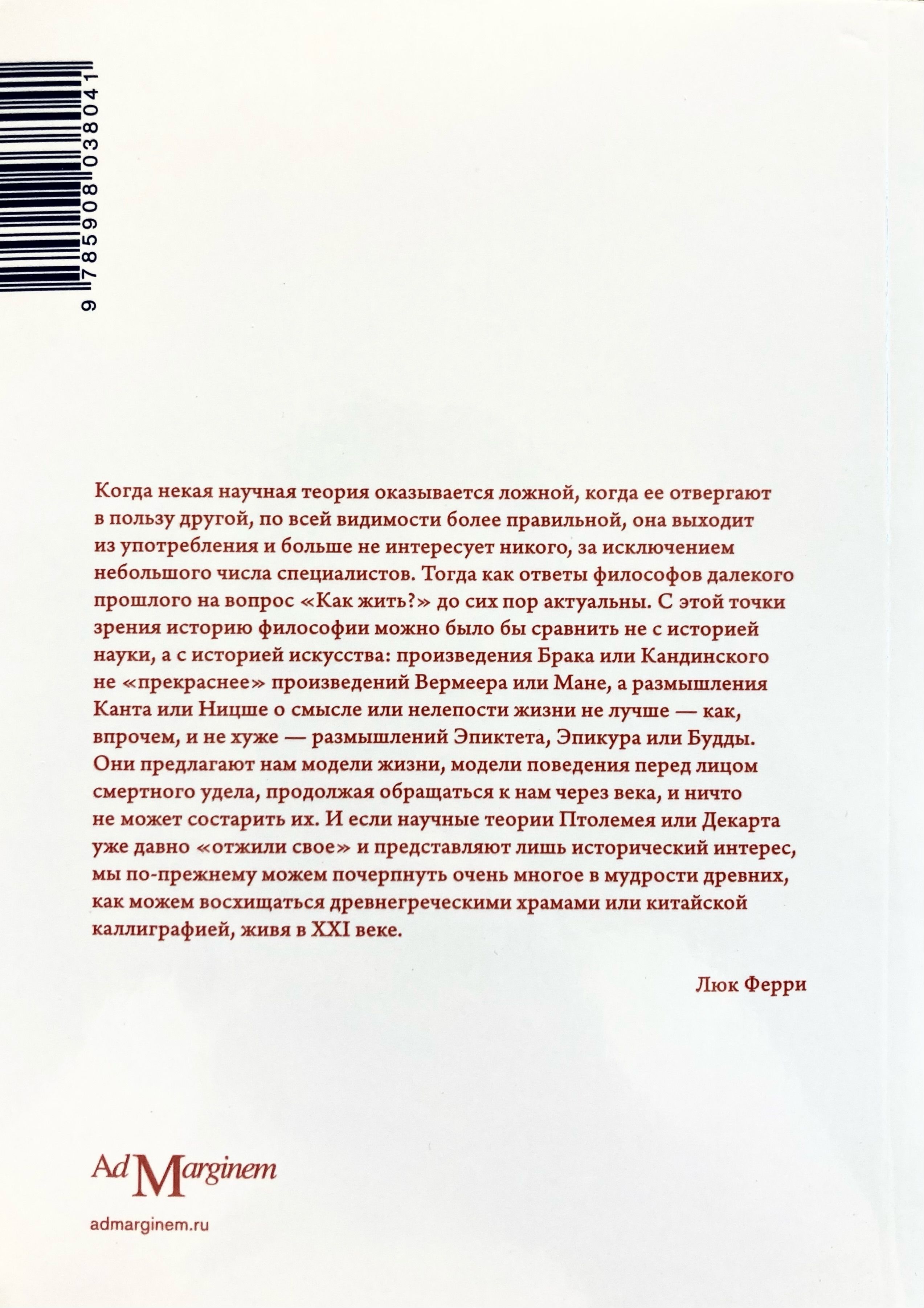 Люк Ферри – известный французский философ, публицист и политик (министр по делам молодежи, образования и науки в 2002–2004 годах), адресует свою новую книгу всем, кто, не занимаясь философией профессионально, хотел бы иметь о ней представление, выходящее за рамки простого перечисления имен мыслителей и названий их теорий. Выделяя в истории западной мысли четыре основные вехи — античный стоицизм, рационализм Нового времени, философию Ницше и постмодернизм, — Ферри показывает, как все они, уточняя и развивая идеи друг друга, решают ключевые для человечества проблемы познания, морали и спасения. Будучи кратким, доступным любому читателю и вместе с тем достаточно углубленным введением в философию, книга также является последовательным изложением взгляда автора на современное состояние мысли.