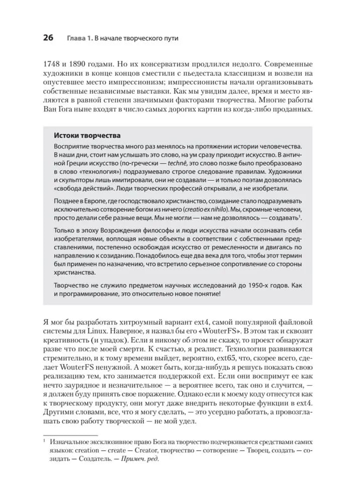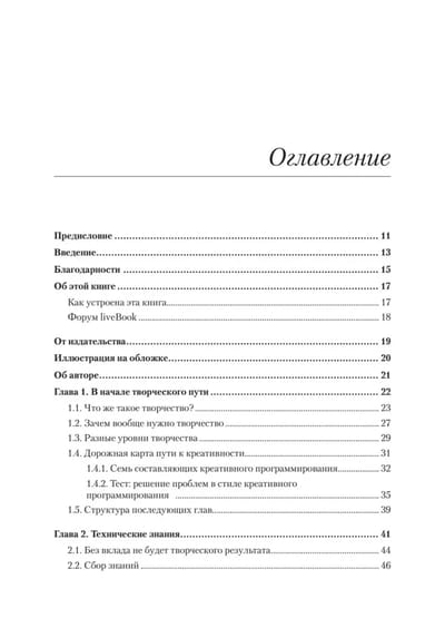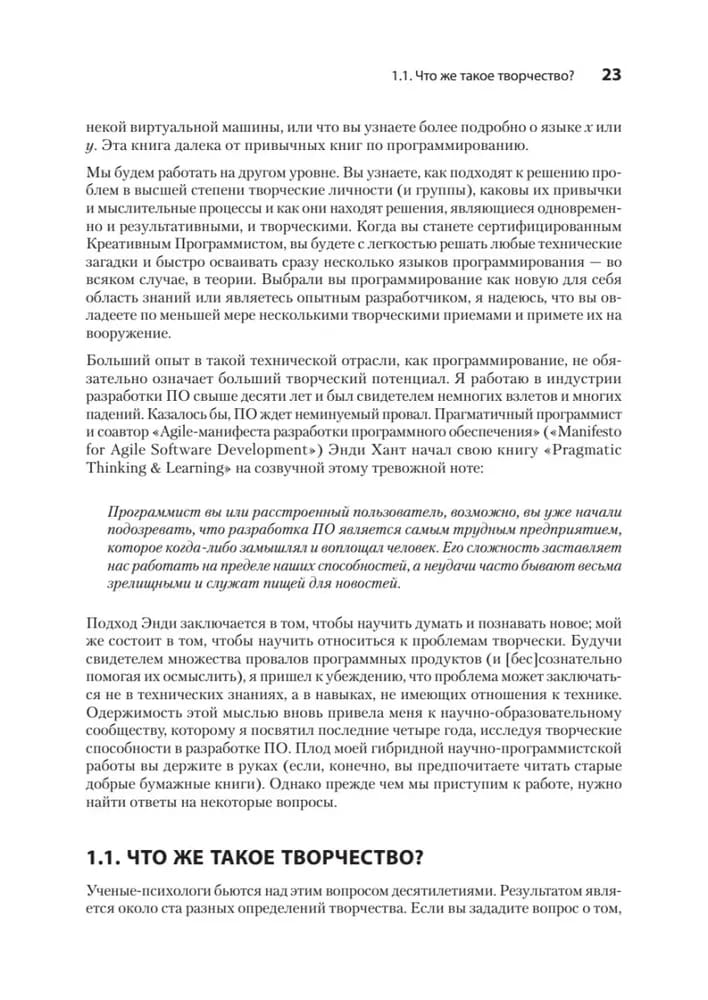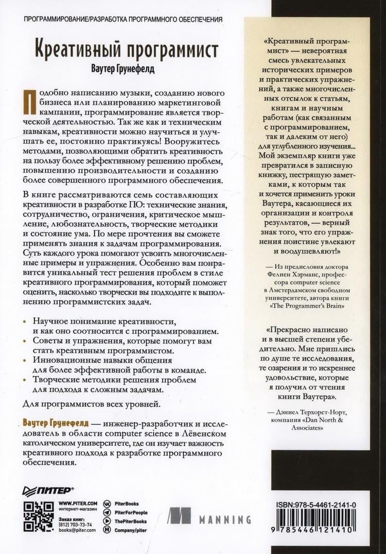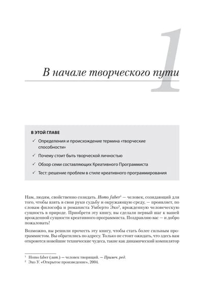 Подобно написанию музыки, созданию нового бизнеса или планированию маркетинговой кампании, программирование является творческой деятельностью. Так же, как и техническим навыкам, креативности можно научиться и улучшать ее, постоянно практикуясь! Вооружитесь методами, позволяющими обратить креативность на пользу более эффективному решению проблем, повышению производительности и созданию более совершенного программного обеспечения.