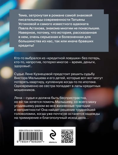 Тема, затронутая в романе самой знаковой писательницы современности Татьяны Устиновой и самого известного адвоката Павла Астахова, знакома многим не понаслышке. Наверное, потому, что история, рассказанная в нем, очень серьезная и болезненная для большинства из нас, так или иначе бравших кредиты! Кто-то выбрался из «кредитной ловушки» без потерь, кто-то, напротив, потерял многое — время, деньги, здоровье!.. Судье Лене Кузнецовой предстоит решить судьбу Виктора Малышева и его детей, которые вот-вот могут потерять квартиру, купленную когда-то по ипотеке. Одновременно ее сестра попадает в лапы кредитных мошенников. Лена — судья и должна быть беспристрастна, но ей так хочется помочь Малышеву, со всего маху угодившему разом во все жизненные трагедии и неприятности! Она найдет решение труднейшей головоломки, когда уже почти не останется надежды на примирение и благополучный исход дела…