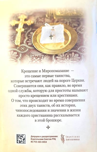 Крещение — это самое первое таинство, которое встречает людей на пороге Церкви. Миропомазание, как правило, совершается непосредственно вслед за Крещением, по-этому присутствующие на этой службе даже не успевают осознать, что становятся свидетелями не одного священнодействия, а двух. О том, что происходит во время совершения таинств Крещения и Миропомазания, о их истории, чинопоследовании и значении в жизни каждого христианина рассказывается в этой брошюре.