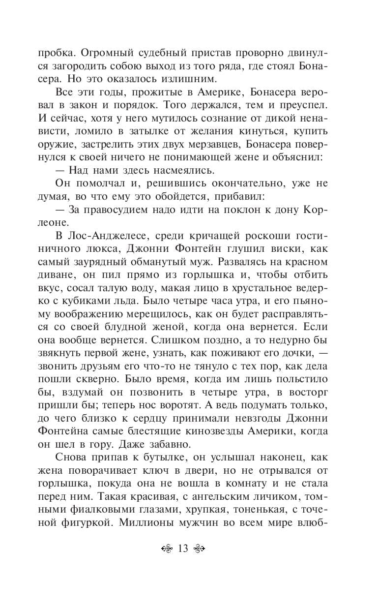 «‎Крестный отец»‎ – классический роман о жизни одного из могущественных преступных синдикатов  Америки – мафиозном клане дона Корлеоне. Написанная с потрясающей достоверностью книга позволяет читателю без риска для жизни заглянуть в святая святых мафии.