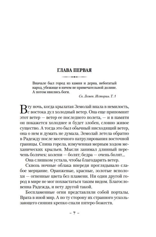 Город-государство Радежда поделен между пятью сектами, каждая поклоняется своему богу. Юная Земолай, рожденная в секте книжников, с ранних лет мечтала стать воином, примкнуть к секте их бога, обрести право на крылья, чтобы защищать жителей города, который она любила. Мечта Земолай сбывается, крылья у нее за спиной, и двадцать шесть долгих лет она верой и правдой служит в крылатом воинстве. Но однажды все рушится. Возвращаясь с очередного дежурства, она совершает проступок, несовместимый с жесткими нормами, установленными для них божеством. Она проявляет жалость, недопустимый акт милосердия к человеку, поклоняющемуся чужому богу. И сразу теряет все, ради чего жила. Пытаясь разобраться в случившемся, Земолай начинает осознавать, что государство, которое она защищала, и боги, дремлющие где-то на небесах, вовсе не та основа, на которой держится мир, и единственное, что ей остается, встать на сторону тех, кто этой тирании противостоит.
