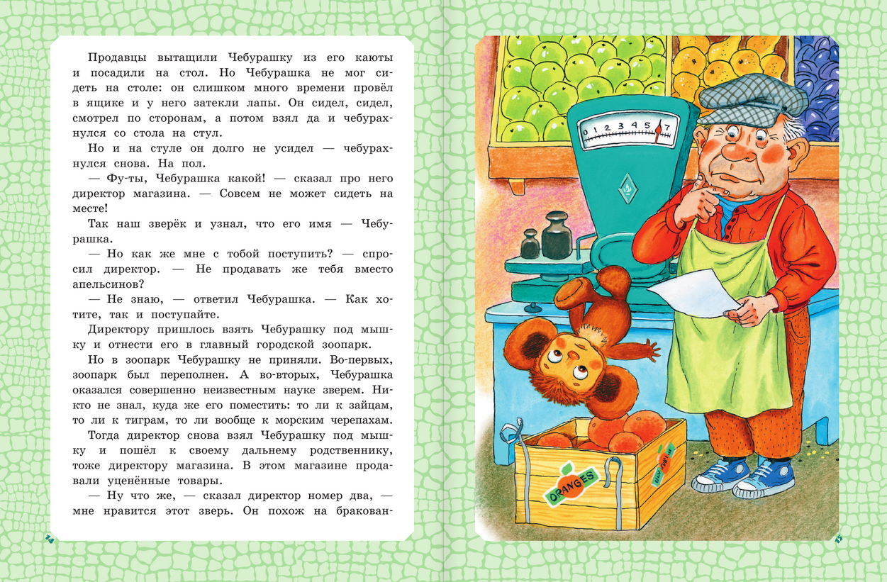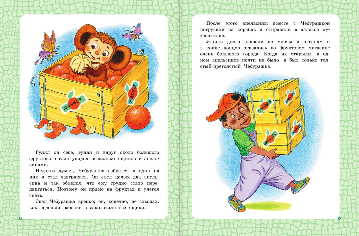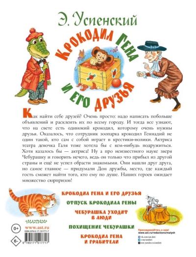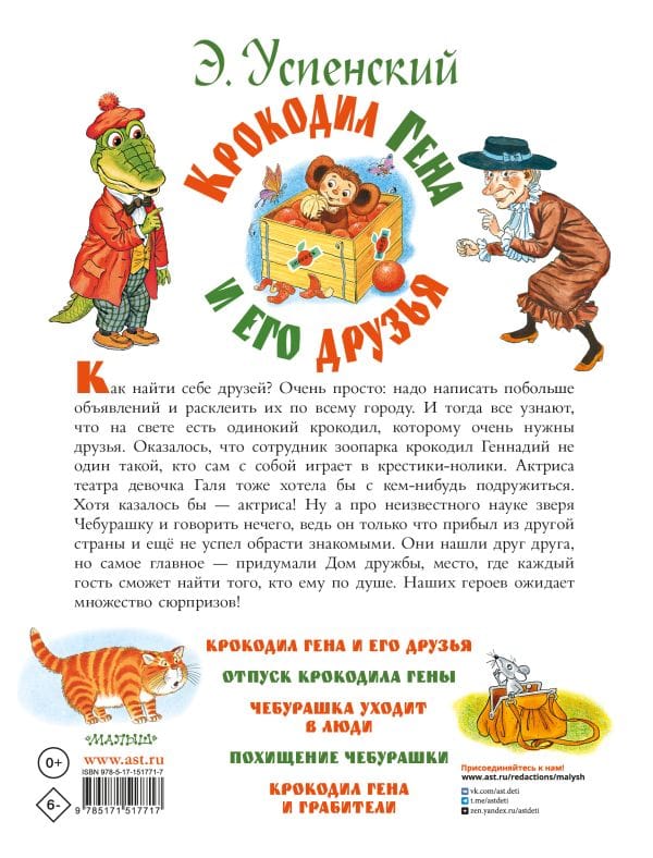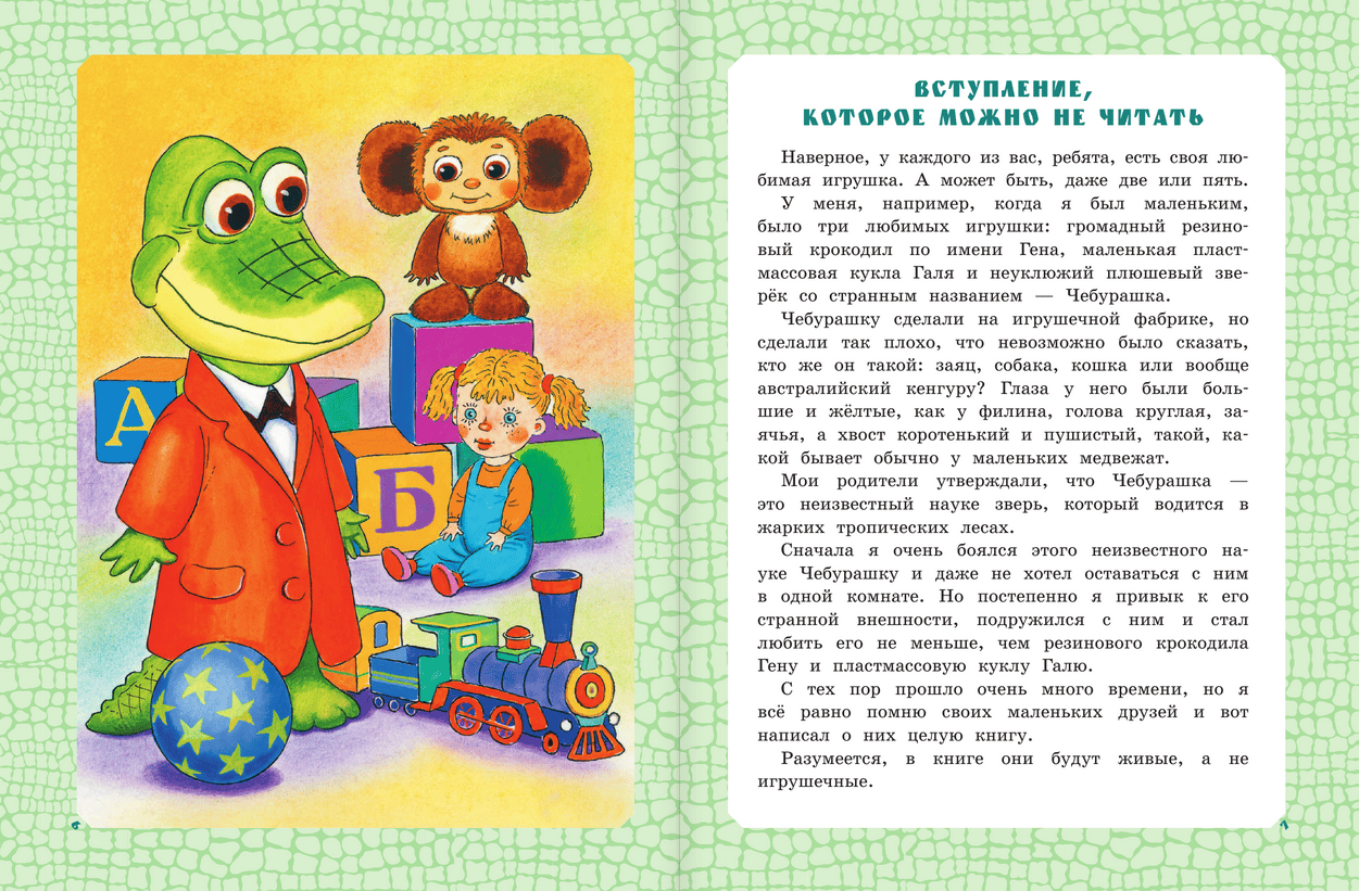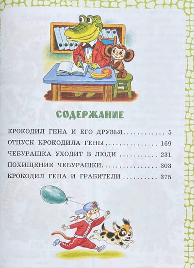 В этой книге — пять повестей про Чебурашку и крокодила Гену: «Крокодил Гена и его друзья» (мультфильмы «Крокодил Гена и его друзья», «Чебурашка»); «Отпуск крокодила Гены» (мультфильм «Шапокляк»), «Чебурашка уходит в люди»; «Похищение Чебурашки» и «Крокодил Гена и грабители». Иллюстрации ко всем повестям сделали художники С.Бордюг и Н.Трепенок. Это полное собрание приключений крокодила Гены и Чебурашки — от их знакомства друг с другом и новыми товарищами (и разумеется, со старухой Шапокляк!) до детективной истории про ограбление шоколадной фабрики. Наши герои стали чуточку старше, мудрее, но не потеряли своего обаяния и дружелюбия.
