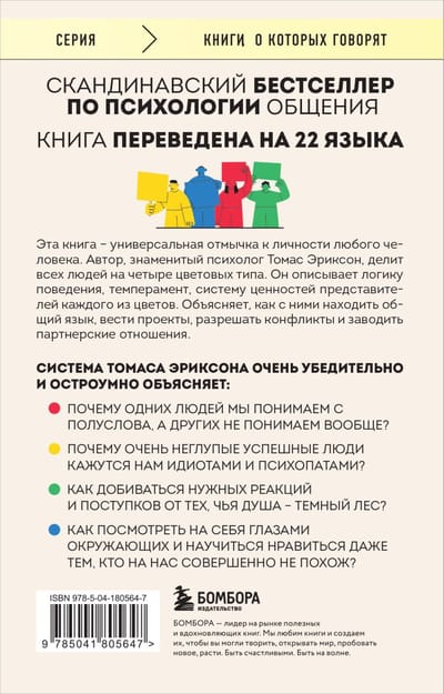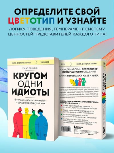 В основе книги лежит несложная методика цветотипирования человеческих характеров. Шведский психолог Томас Эриксон делит всех людей на четыре типа: красный, желтый, зеленый, синий — и очень увлекательно, на узнаваемых примерах описывает логику поведения, темперамент, систему ценностей представителей каждого типа. Казалось бы, ничего нового. Подобный подход использовался психологами на протяжении десятилетий. Но Томасу Эриксону удалось придумать настолько удобную систему работы с известными инструментами, что сегодня книга «Кругом одни идиоты» лежит на столе каждого шведского руководителя, учителя и журналиста.