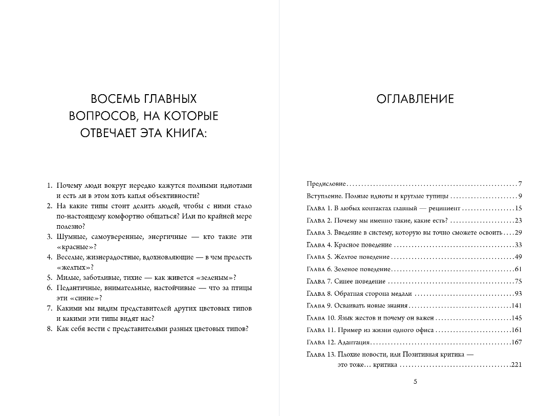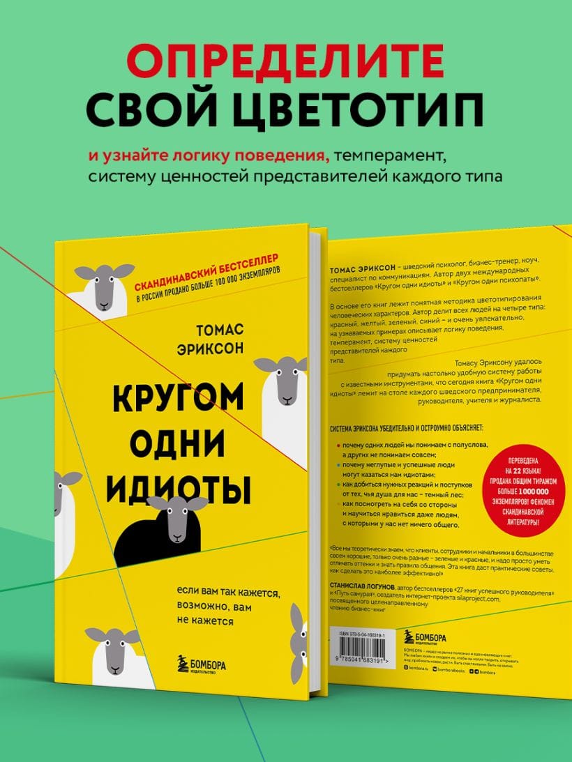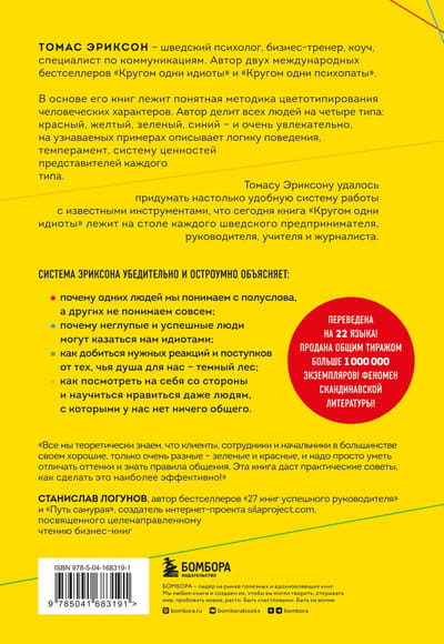 В основе книги лежит несложная методика цветотипирования человеческих характеров. Шведский психолог Томас Эриксон делит всех людей на четыре типа: красный, желтый, зеленый, синий — и очень увлекательно, на узнаваемых примерах описывает логику поведения, темперамент, систему ценностей представителей каждого типа. Казалось бы, ничего нового. Подобный подход использовался психологами на протяжении десятилетий. Но Томасу Эриксону удалось придумать настолько удобную систему работы с известными инструментами, что сегодня книга «Кругом одни идиоты» лежит на столе каждого шведского руководителя, учителя и журналиста.