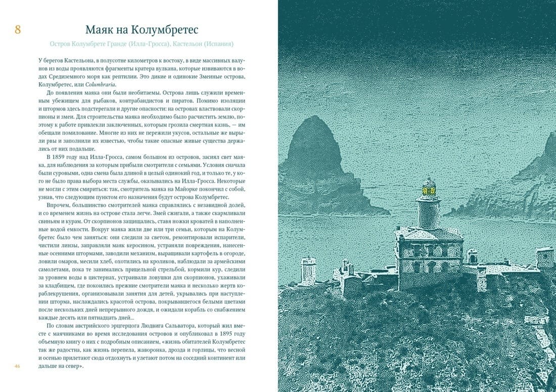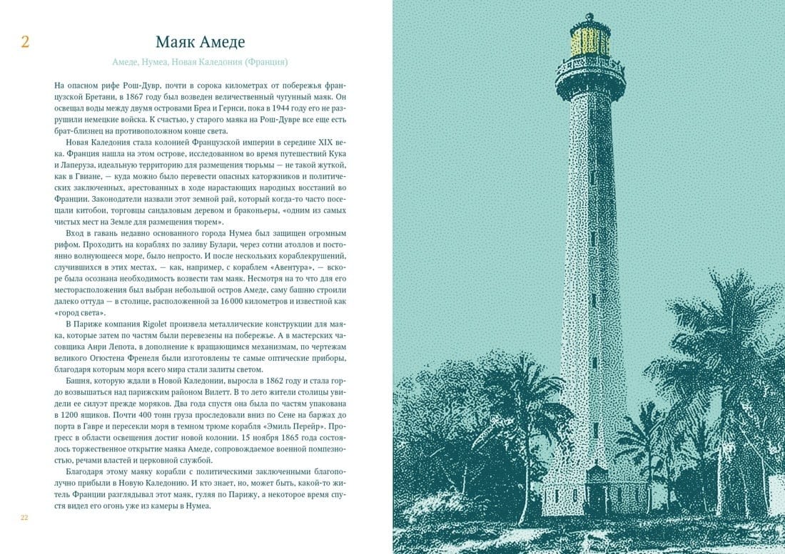В этом необычном путешествии к самым отдаленным маякам на планете вы познакомитесь не только с особенностями их архитектуры, внутреннего устройства и технического оснащения, но и со множеством увлекательных историй, связанных со строительством маяков и с их смотрителями, с кораблекрушениями и с мистическими происшествиями. Это и рассказ о слепом смотрителе маяка за полярным кругом, о пришедшей на помощь терпящим бедствие морякам бесстрашной девушке, о призраке мичмана, являющемся на маяк каждую ночь и выстукивающем на пишущей машинке некое предостережение, о странном человеке, который предпочел укрыться от всех в башне в открытом море… В этих историях сходятся мотивы и творческие горизонты Жюля Верна, Эдгара Аллана По, Вирджинии Вулф, проведшей детство на маяке, Редьярда Киплинга, Рэя Брэдбери и других великих писателей, стремившихся поведать миру об одиночестве, о тревоге, о храбрости и счастье.