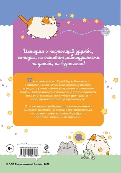 Познакомьтесь с Пушмяу и Блошью — неразлучными котиками, которые вместе находят приключения, устраивают смешные поиски потерянных клубочков, иногда ссорятся, но в итоге всегда понимают друг друга и поддерживают в трудную минуту.