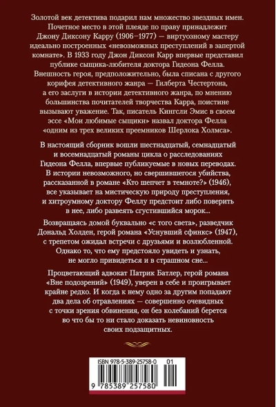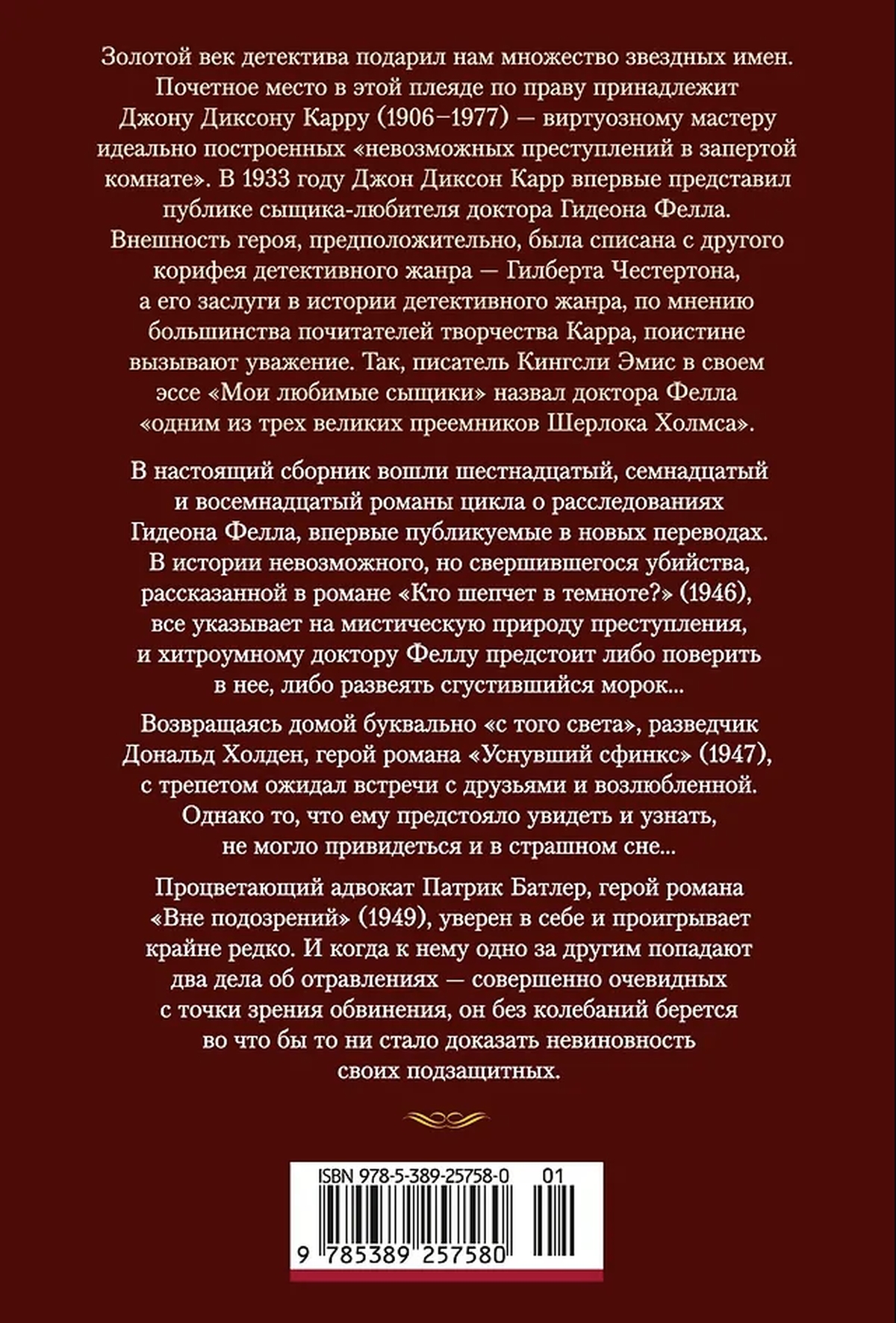 Золотой век детектива подарил нам множество звездных имен. Почетное место в этой плеяде по праву принадлежит Джону Диксону Карру (1906–1977) — виртуозному мастеру идеально построенных «невозможных преступлений в запертой комнате». В 1933 году Джон Диксон Карр впервые представил публике сыщика-любителя доктора Гидеона Фелла. Внешность героя, предположительно, была списана с другого корифея детективного жанра — Гилберта Честертона, а его заслуги в истории детективного жанра, по мнению большинства почитателей творчества Карра, поистине вызывают уважение. Так, писатель Кингсли Эмис в своем эссе «Мои любимые сыщики» назвал доктора Фелла «одним из трех великих преемников Шерлока Холмса».