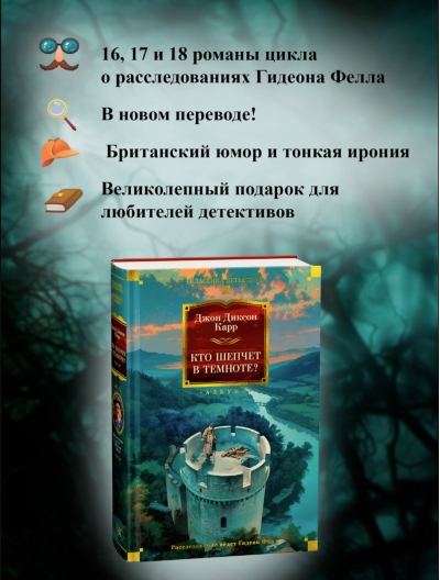 В истории невозможного, но свершившегося убийства, рассказанной в романе «Кто шепчет в темноте?» (1946), все указывает на мистическую природу преступления, и хитроумному доктору Феллу предстоит либо поверить в нее, либо развеять сгустившийся морок…