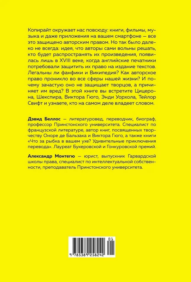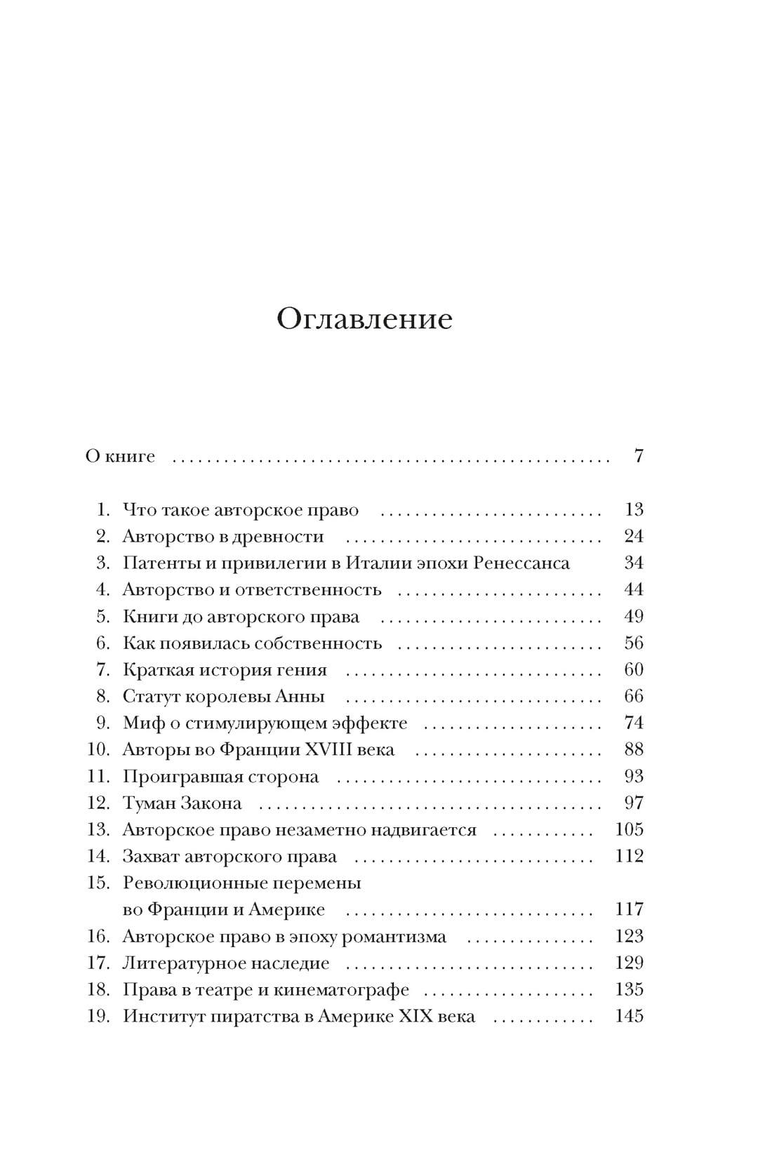 Литературовед Дэвид Беллос и юрист Александр Монтегю объединили силы, чтобы выяснить, как возникла идея копирайта и почему право на интеллектуальную собственность понадобилось защищать. В их увлекательном и ироничном повествовании нашлось место спорам античных мыслителей, старым английским законам, западной поп-музыке и махинациям лоббистов.