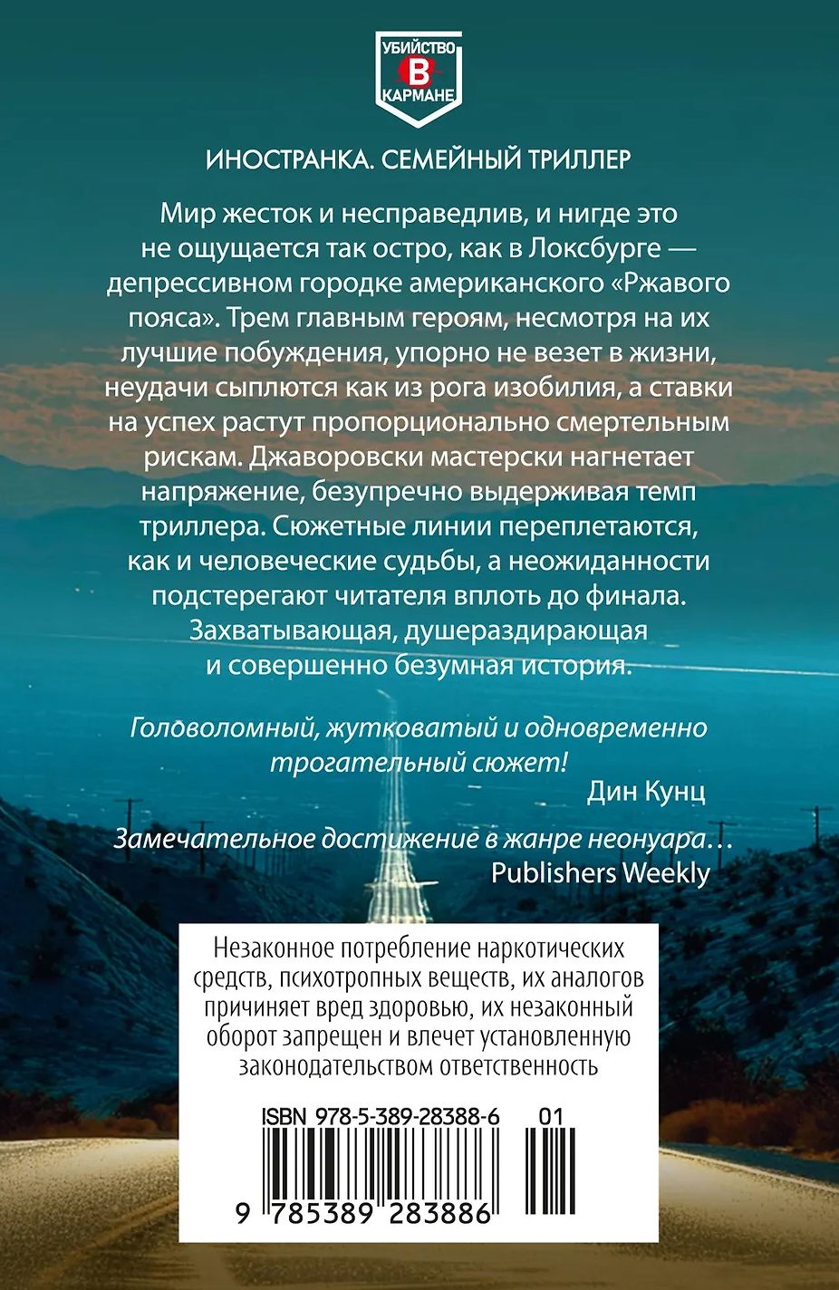 В умирающем городке американского «Ржавого пояса» переплетаются истории трех персонажей. Карла, мать-одиночка, отчаявшаяся вырваться из порочного круга бедности, готова поставить на кон все, лишь бы помочь сыну скрыть ужасную тайну. Рид, юноша-аутист, должен во что бы то ни стало сдержать обещание, данное недавно погибшей матери. Лиз, начинающей певице кантри, наконец улыбается удача, но она знает, что обречена, если не отдаст долг безжалостному бандиту. Этот стремительный неонуарный триллер с живыми, вызывающими сопереживание героями собрал восхищенные овации как читателей, так и критиков.