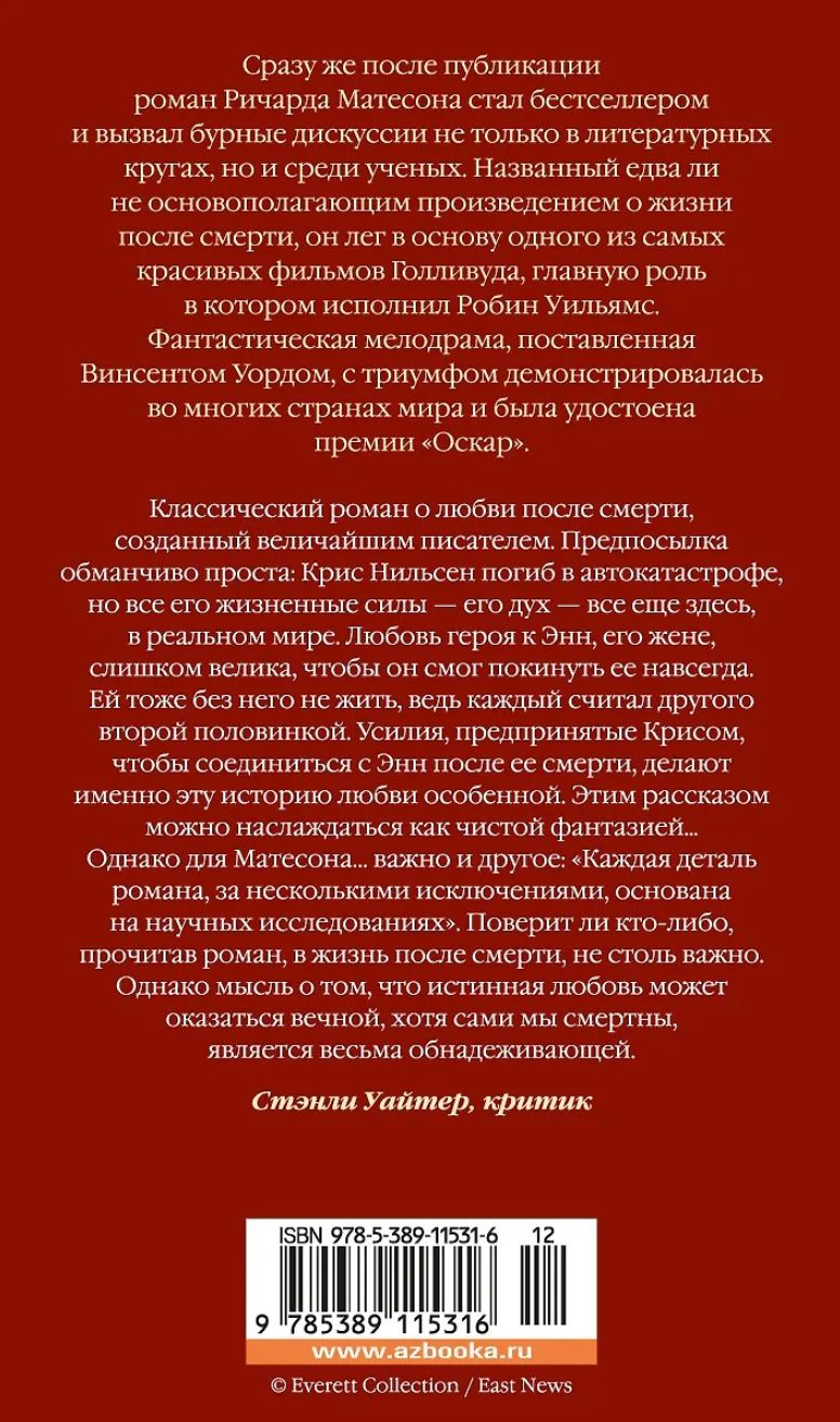 Сразу же после публикации роман Р. Матесона стал бестселлером и вызвал бурные дискуссии не только в литературных кругах, но и среди ученых. Названный едва ли не основополагающим произведением о жизни после смерти, он лег в основу одного из самых красивых фильмов Голливуда, главную роль в котором исполнил Робин Уильямс. Фантастическая мелодрама, поставленная Винсентом Уордом, с триумфом демонстрировалась во многих странах мира и была удостоена премии «Оскар».