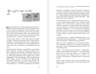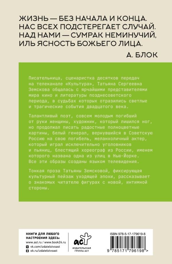 Писательница, сценаристка десятков передач на телеканале «Культура», Татьяна Сергеевна Земскова общалась с ярчайшими представителями мира кино и литературы позднесоветского периода, в судьбах которых отразились светлые и трагические события двадцатого века.