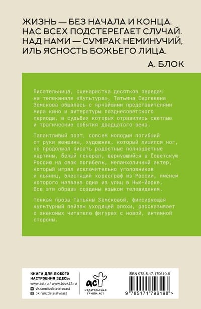 Тонкая проза Татьяны Земсковой, фиксирующая культурный пейзаж уходящей эпохи, рассказывает о знакомых читателю фигурах с новой, интимной стороны.