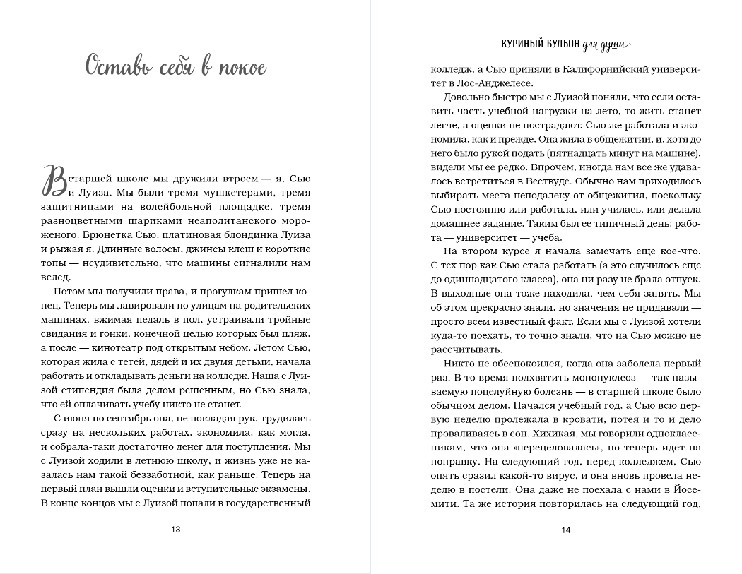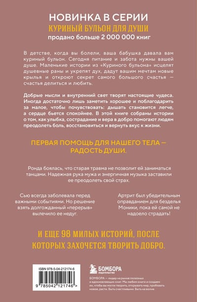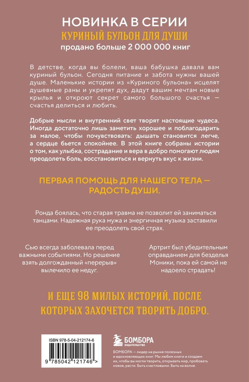 В детстве, когда вы болели, ваша бабушка давала вам куриный бульон. Сегодня питание и забота нужны вашей душе. Маленькие истории из «Куриного бульона» исцелят душевные раны и укрепят дух, дадут вашим мечтам новые крылья и откроют секрет самого большого счастья — счастья делиться и любить.