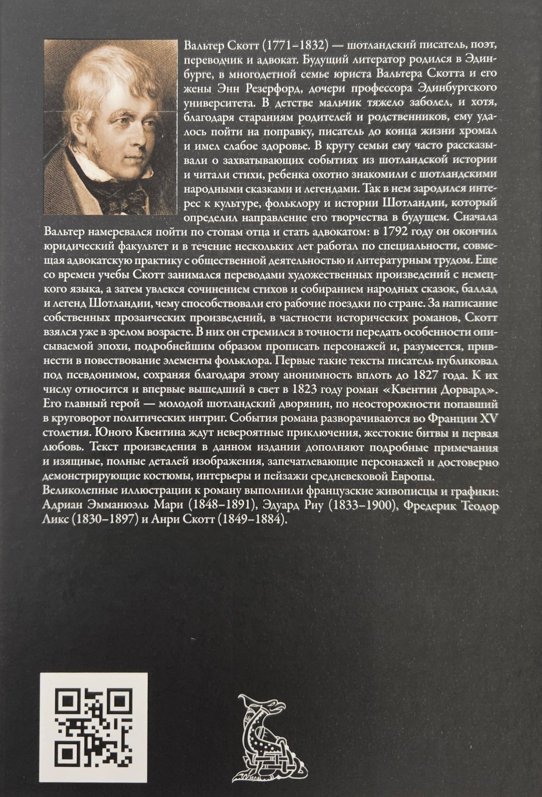 Вальтер Скотт (1771–1832) — шотландский писатель, поэт, переводчик и адвокат. В 1823 году в Лондоне впервые вышел в свет его блистательный исторический роман «Квентин Дорвард». Это захватывающая история о дружбе, любви, приключениях, долге и отваге. Перевод текста романа, представленный в данном издании, был выполнен Марией Андреевной Шишмаревой (1852–1939). Книгу украшают иллюстрации четырех талантливых французских художников, мастеров своего дела: Адриана Эмманюэля Мари (1848–1891), Эдуарда Риу (1833–1900), Фредерика Теодора Ликса (1830–1897) и Анри Скотта (1849–1884).
