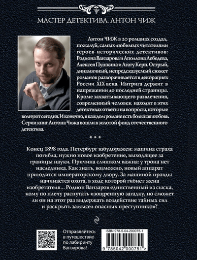 Конец 1898 года. Петербург взбудоражен: машина страха погибла, нужно новое изобретение, выходящее за границы науки. Причина слишком важна: у трона нет наследника. Как знать, возможно, новый аппарат пригодится императорскому двору. За машиной правды начинается охота, в ходе которой гибнет жена изобретателя… Родион Ванзаров единственный из сыска, кому по плечу распутать изощренную загадку, но сможет ли он в этот раз выдержать воздействие тайных сил и раскрыть замысел опасных преступников?