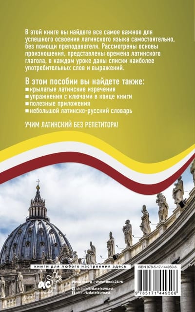 Данный самоучитель поможет читателям самостоятельно без помощи преподавателя овладеть азами латинского языка. В этой книге вы найдете правила чтения и произношения, самые нужные грамматические темы, а также узнаете основные латинские времена. Материал в пособии изложен максимально понятно и доступно, хорошо запоминается благодаря большому количеству примеров с широкоупотребительной лексикой. К каждому уроку дается словарик с новыми и полезными словами, также приводятся крылатые латинские изречения. Для успешного закрепления пройденной темы даны упражнения, ключи к которым помещены в конце книги. Вы также можете воспользоваться полезными приложениями и латинско-русским словарем. Пособие предназначается для широкого круга лиц, изучающих латинский язык, и в первую очередь для тех, кто учится самостоятельно.