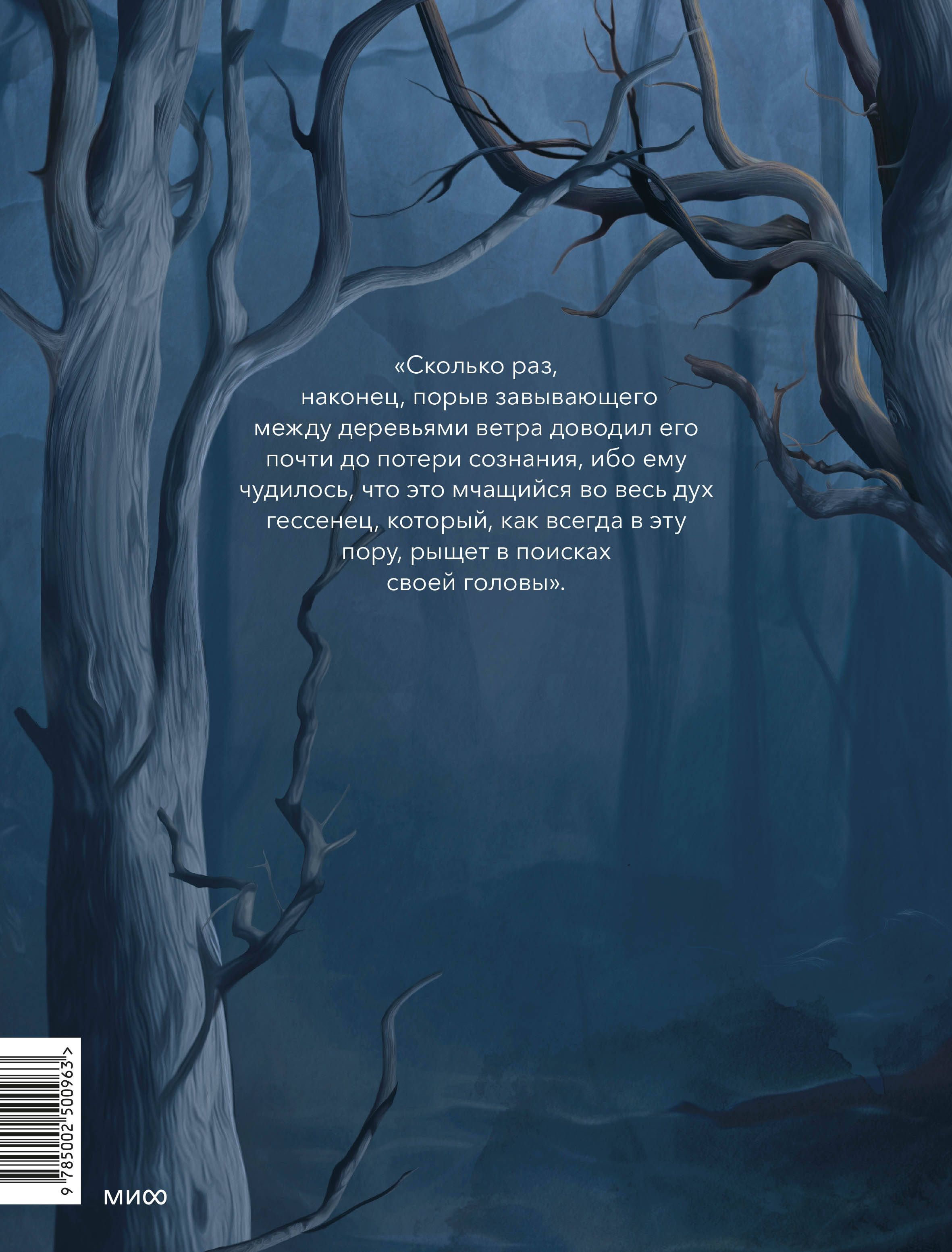 «Сколько раз останавливался он, полумертвый от страха, перед запорошенным снегом кустом, который, точно привидение в саване, преграждал ему путь! Сколько раз леденел он от ужаса, заслышав на мерзлом снегу свои собственные шаги и боясь оглянуться назад, чтобы не обнаружить у себя за спиной какое-нибудь чудовище, преследующее его по пятам! Сколько раз, наконец, порыв завывающего между деревьями ветра доводил его почти до потери сознания, ибо ему чудилось, что это мчащийся во весь дух гессенец, который, как всегда в эту пору, рыщет в поисках своей головы».