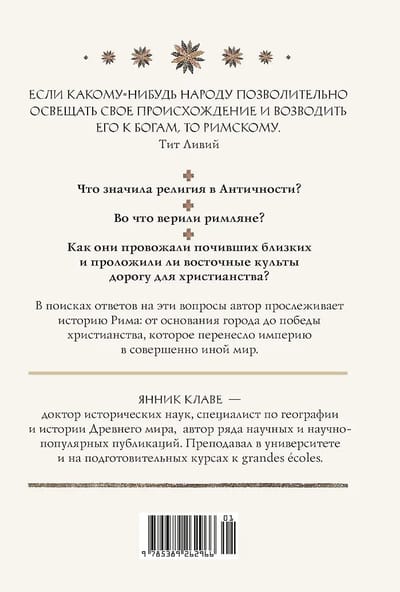 Выдающийся историк Янник Клаве предлагает читателю всеобъемлющий и динамичный взгляд на религиозное разнообразие римского мира. Как вышло, что скромный и бедный вначале народ, изолированно проживавший в Лации и окруженный сильными соседями, всего за несколько веков создал настолько могущественную империю? Насколько религия была важна для Рима, и почему эта империя просуществовала так долго? В поисках ответов на эти вопросы автор прослеживает историю Рима: от основания города до победы христианства, которое перенесло империю в совершенно иной мир.