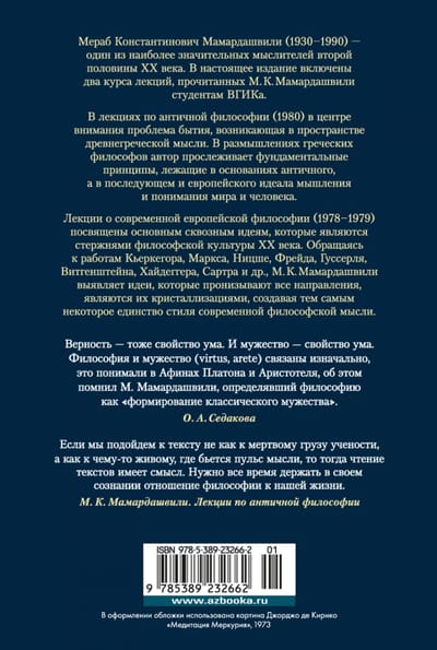 Мераб Константинович Мамардашвили (1930–1990) — один из наиболее значительных мыслителей второй половины ХХ века. В настоящее издание включены два курса лекций, прочитанных М. К. Мамардашвили студентам ВГИКа. В лекциях по античной философии (1980) в центре внимания проблема бытия, возникающая в пространстве древнегреческой мысли. В размышлениях греческих философов автор прослеживает фундаментальные принципы, лежащие в основаниях античного, а в последующем и европейского идеала мышления и понимания мира и человека. Лекции о современной европейской философии (1978–1979) посвящены основным сквозным идеям, которые являются стержнями философской культуры ХХ века. Обращаясь к работам Кьеркегора, Маркса, Ницше, Фрейда, Гуссерля, Витгенштейна, Хайдеггера, Сартра и др., М. К. Мамардашвили выявляет идеи, которые пронизывают все направления, являются их кристаллизациями, создавая тем самым некоторое единство стиля современной философской мысли.