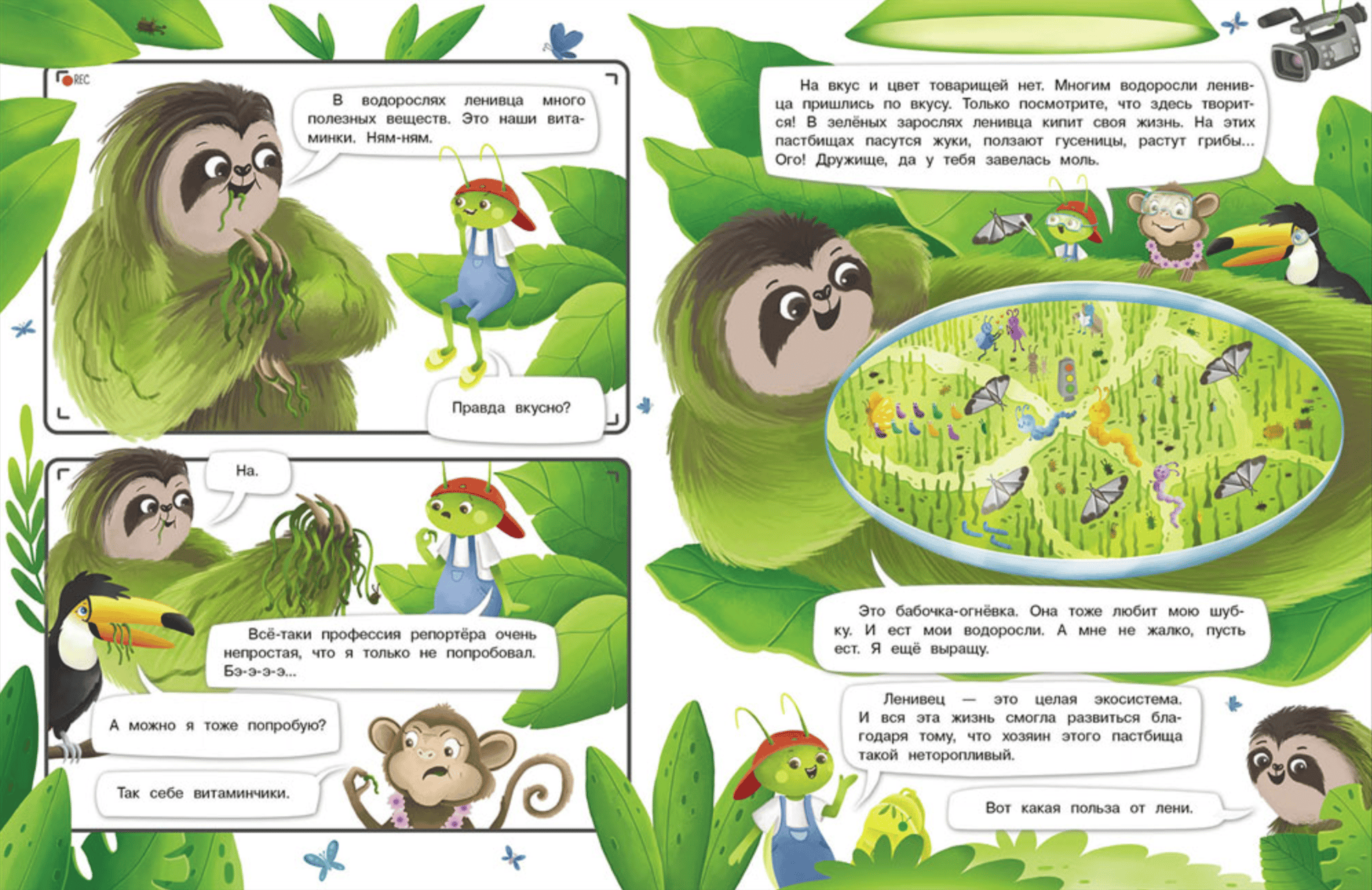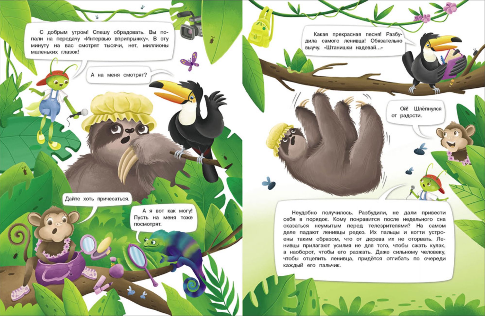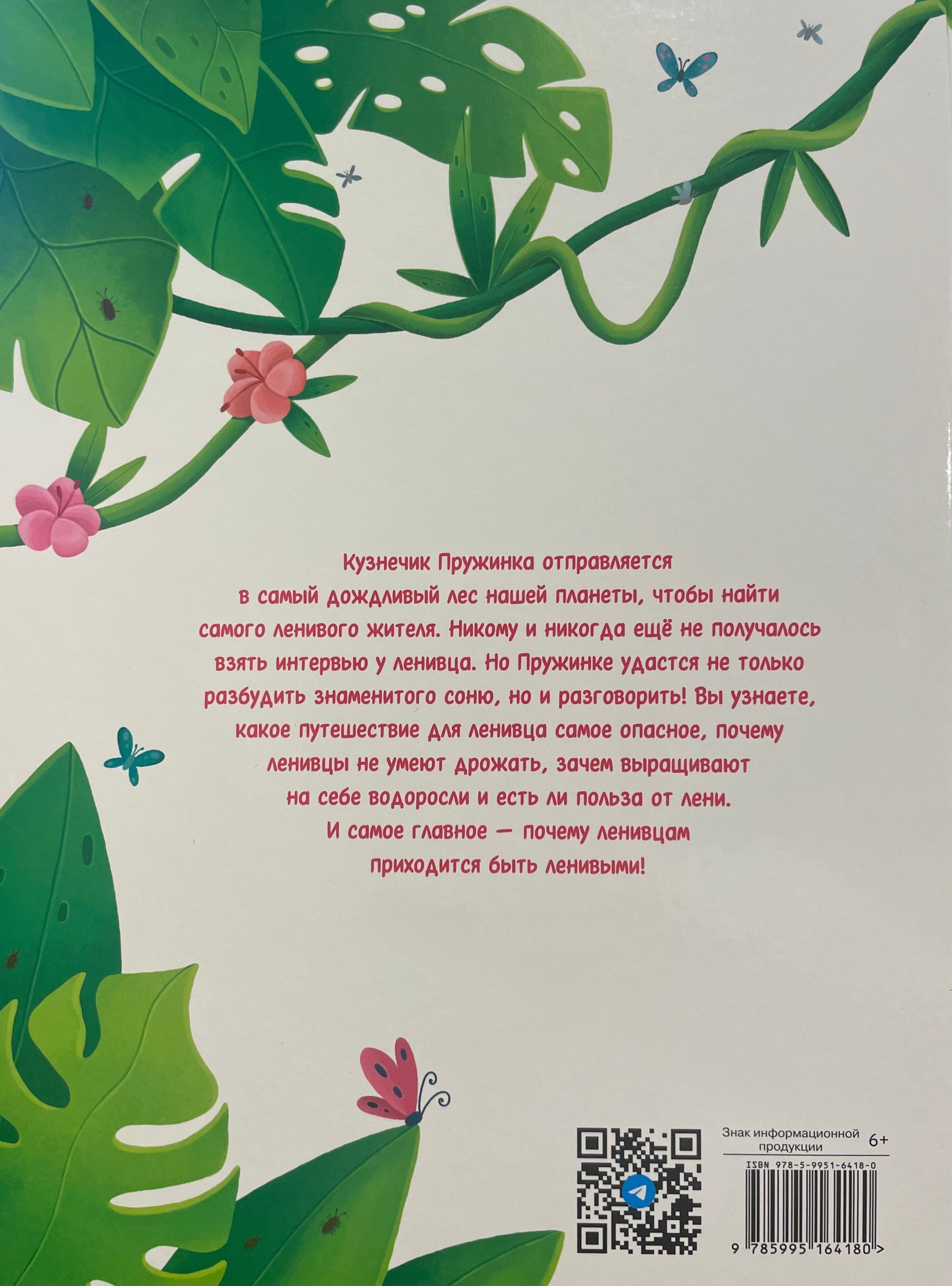 Кузнечик Пружинка – репортер в мире животных. В его волшебном рюкзаке найдется все, что поможет взять интервью у любого животного: и в непроходимых джунглях, и в жаркой Африке глубоко под водой и высоко в небе. В каждом путешествии Пружинку ждут невероятные открытия, новые друзья и удивительные приключения. Репортер Пружинка долго ждал и дождался интервью у самого медленного зверька на свете ленивца.