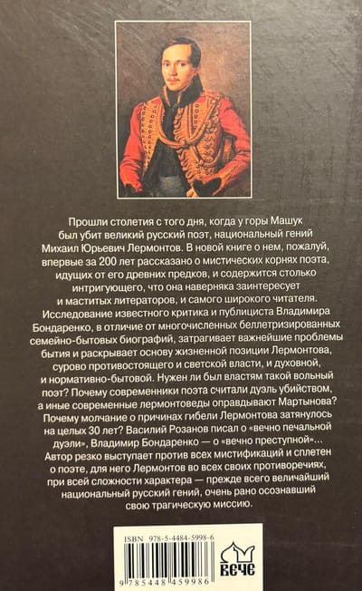 Исследование известного критика и публициста Владимира Бондаренко, в отличие от многочисленных беллетризированных семейно-бытовых биографий, затрагивает важнейшие проблемы бытия и раскрывает основу жизненной позиции Лермонтова, сурово противостоящего и светской власти, и духовной, и нормативно-бытовой. Нужен ли был властям такой вольный поэт? Почему современники поэта считали дуэль убийством, а иные современные лермонтоведы оправдывают Мартынова? Почему молчание о причинах гибели Лермонтова затянулось на целых 30 лет? Василий Розанов писал о «вечно печальной дуэли», Владимир Бондаренко — о «вечно преступной»…
