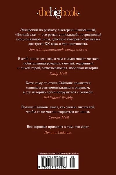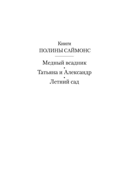 «Летний сад» — завершающий роман трилогии Полины Саймонс, американской писательницы, которая родилась в Советском Союзе в 1963 году и через десять лет вместе с семьей уехала в США. Спустя многие годы Полина вернулась в Россию, чтобы найти материалы для своей книги и вместе с героями пройти сквозь тяжкие испытания, выпавшие на их долю.