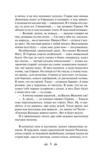 Роман «Лето Господне» — это светлые воспоминания о детстве и родительском доме, о повседневной жизни православной купеческой семьи, наполненной праздниками, радостями, скорбями. Душевный и искренний текст про дореволюционную Россию, где сохранились старинные обычаи и самобытность.