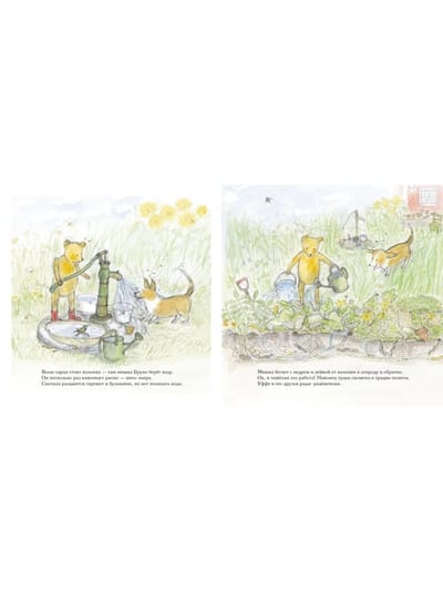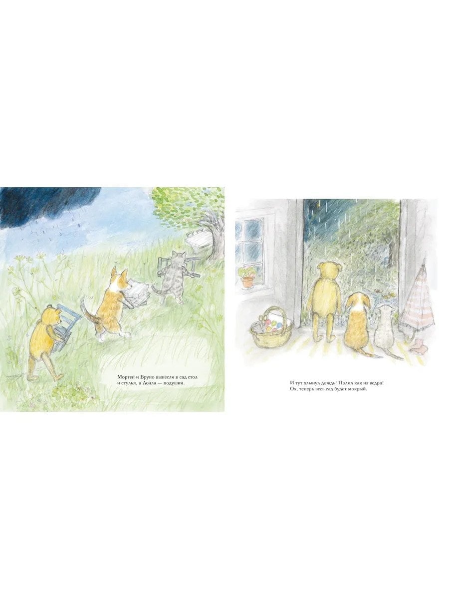 Мишка Бруно и его собака Лолла – герои 4-х книжек-картинок, созданных современной шведской художницей Гуниллой Ингвес. Каждая книга посвящена одному из времен года – зиме, весне, лету и осени – и в ней описывается один день из жизни героев, наполненный занятиями и развлечениями «по сезону». В книге «Лето мишки Бруно» мишка с собакой с утра трудятся в огороде: пропалывают, поливают, удобряют грядки, косят траву. После работы они идут на речку, купаются, наблюдают за водомерками и жуками-плавунцами, потом собирают в лесу малину и даже находят на тропинке змеиную кожу. А вечером друзья принимают гостей и накрывают стол в саду. Главную историю книги «обрамляют» записки из дневника наблюдений Мишки Бруно. В них содержится множество зарисовок и познавательных сведений из мира окружающей природы определенного времени года. Первый дневниковый разворот «Лета мишки Бруно» посвящен садоводству: как правильно приготовить удобрение из крапивы, где именно лучше косить траву и зачем нужны дождевые черви. Второй разворот посвящен перелетным птицам, насекомым и рептилиям, которых можно встретить летом в нашей полосе. Книги из серии о мишек Бруно можно назвать практической энциклопедией времен года для детей 3-6 лет. С нежными иллюстрациями пастельных тонов, множеством деталей для рассматривания на каждой странице и обаятельными главными героями.