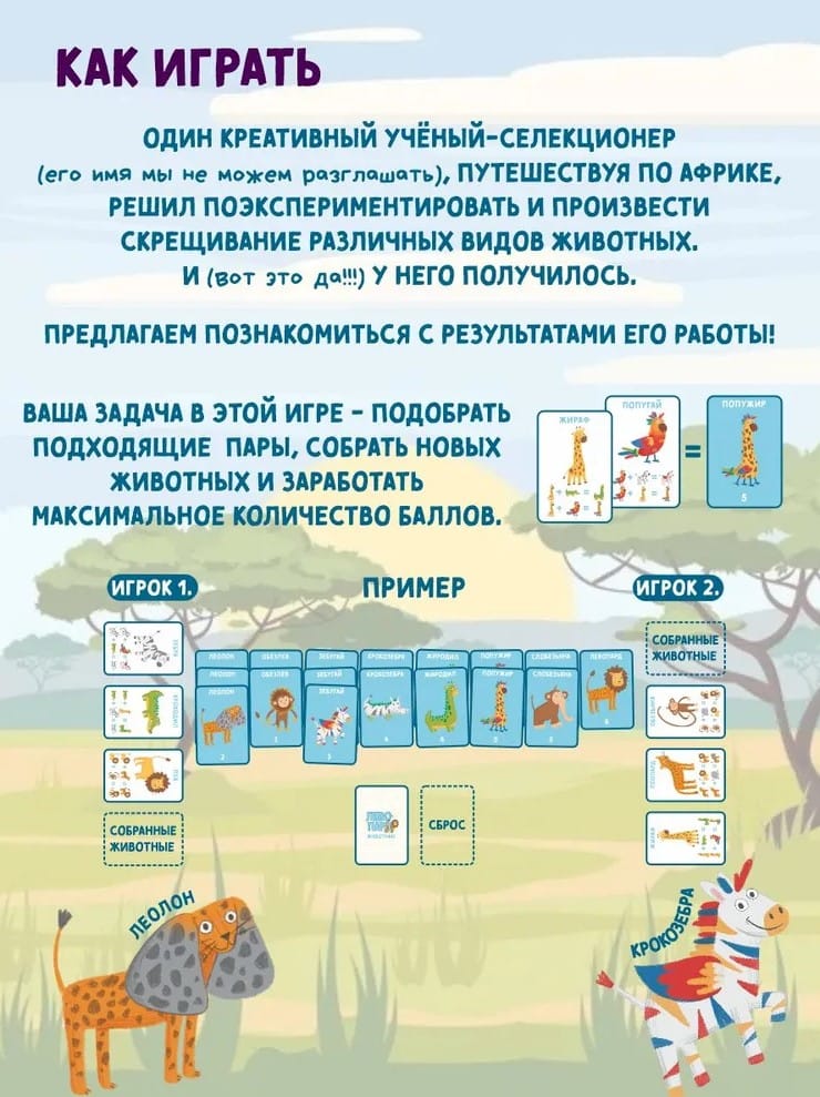Погрузитесь в мир захватывающих приключений и дружеского соперничества! Эта настольная игра идеально подходит для всей семьи и станет настоящим развлечением на ваших вечеринках с друзьями и родными. В наборе вас ждут 96 ярких игральных карт с удивительными зверями, а правила игры настолько просты, что в неё легко войдут игроки любого возраста!