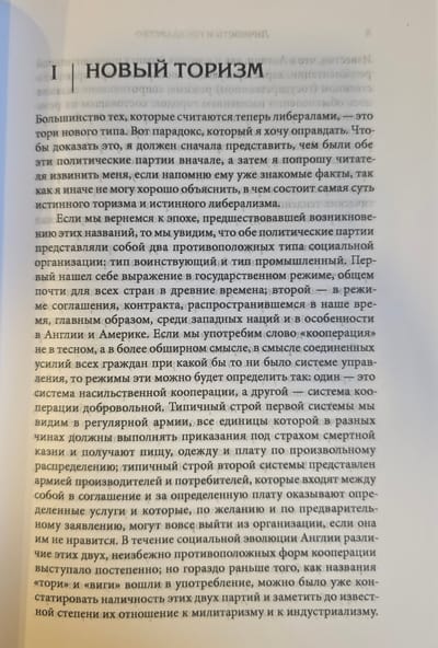 В очерках, собранных в этом томе, автор задокументировал процесс постепенного вырождения в Великобритании после 1850 г. классического либерализма в то, что в ХХ в. станет называться социальным либерализмом, и вызванный этим возврат к меркантилистскому и воинственному социальному порядку. Спенсер показывает, как постепенное приращение власти государства незаметно ведет к деспотизму и порабощению. Он критикует законодателей за игнорирование экономических законов, координирующих желания и усилия людей; атакует доктрину неограниченного суверенитета правительства, будь то монархического или парламентского, и связанную с ней концепцию прав как созданных государством и поэтому с такой же легкостью государством отменяемых.
