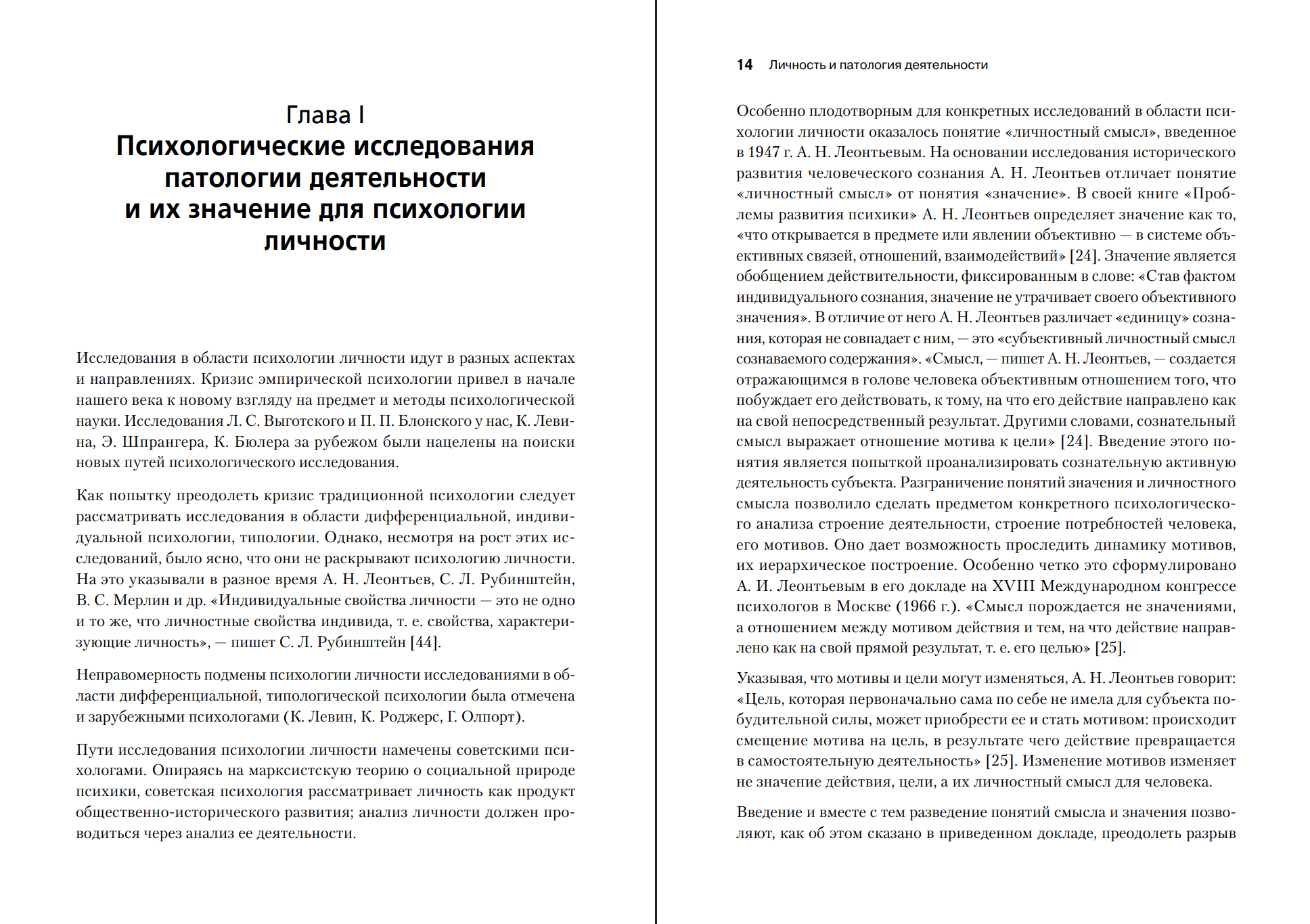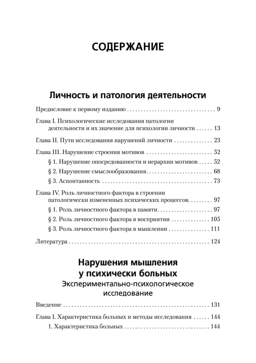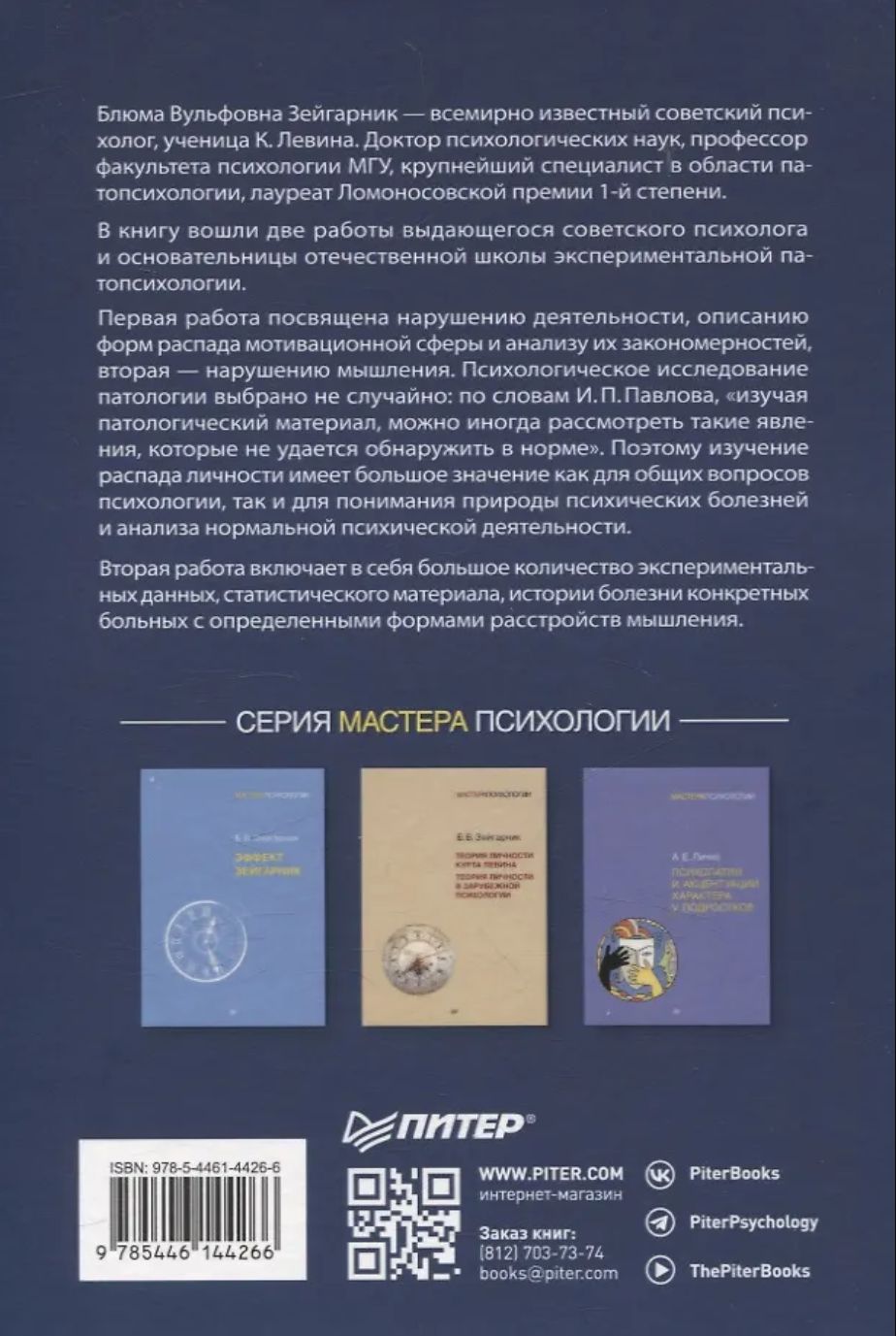 В книгу вошли две работы выдающегося советского психолога и основательницы отечественной школы экспериментальной патопсихологии Б. В. Зейгарник. Первая работа посвящена нарушению деятельности, описанию форм распада мотивационной сферы и анализу их закономерностей, вторая - нарушению мышления. Психологическое исследование патологии выбрано не случайно: по словам И. П. Павлова, «изучая патологический материал, можно иногда рассмотреть такие явления, которые не удается обнаружить в норме». Поэтому изучение распада личности имеет большое значение как для общих вопросов психологии, так и для понимания природы психических болезней и анализа нормальной психической деятельности. Вторая работа включает в себя большое количество экспериментальных данных, статистического материала, истории болезни конкретных больных с определенными формами расстройств мышления.