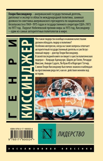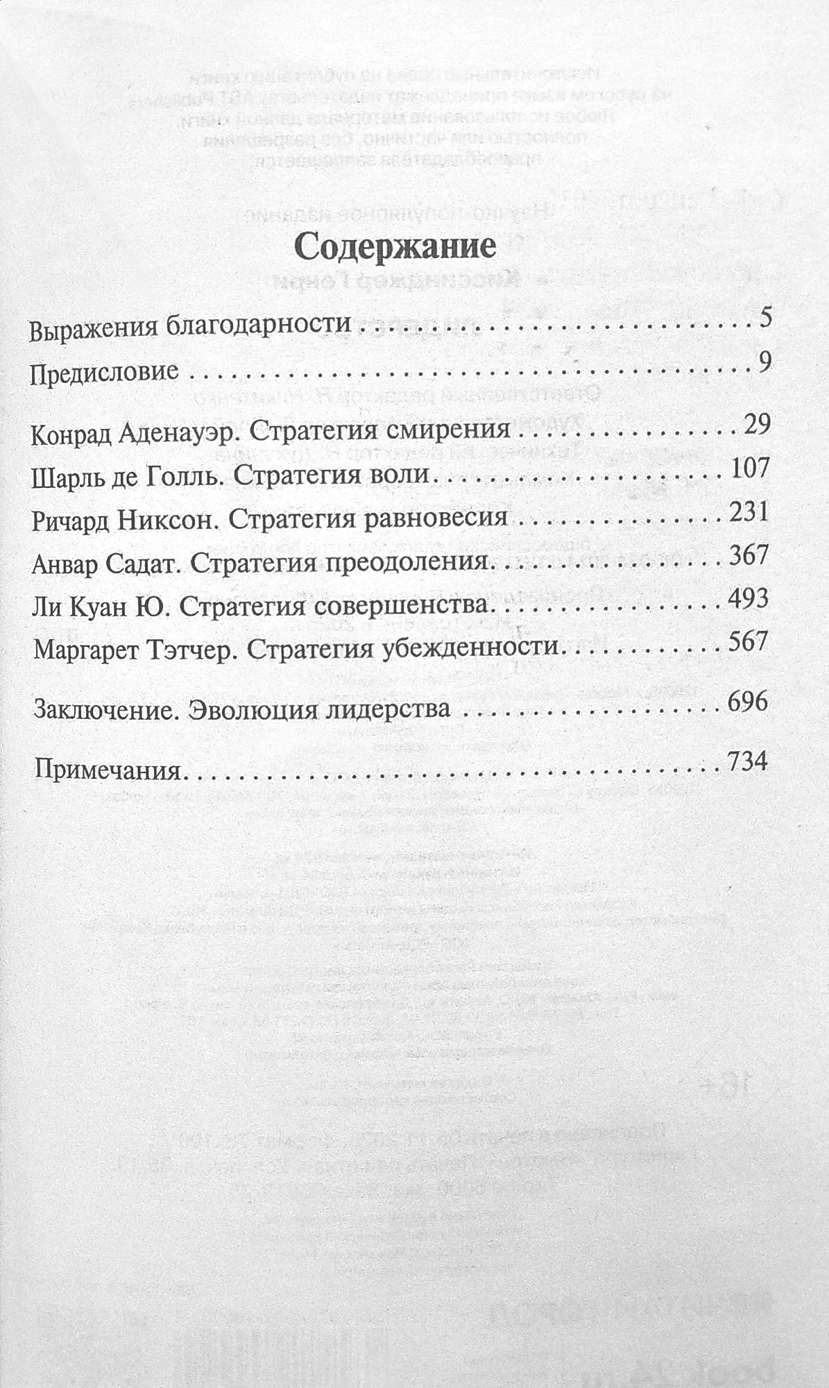В своей последней книге он пишет о шести политических лидерах – Конраде Аденауэре, Шарле де Голле, Ричарде Никсоне, Анваре Садате, Ли Куан Ю и Маргарет Тэтчер. С ними Генри Киссинджер был лично знаком и наблюдал на протяжении ряда лет, как их действия меняли ход истории.